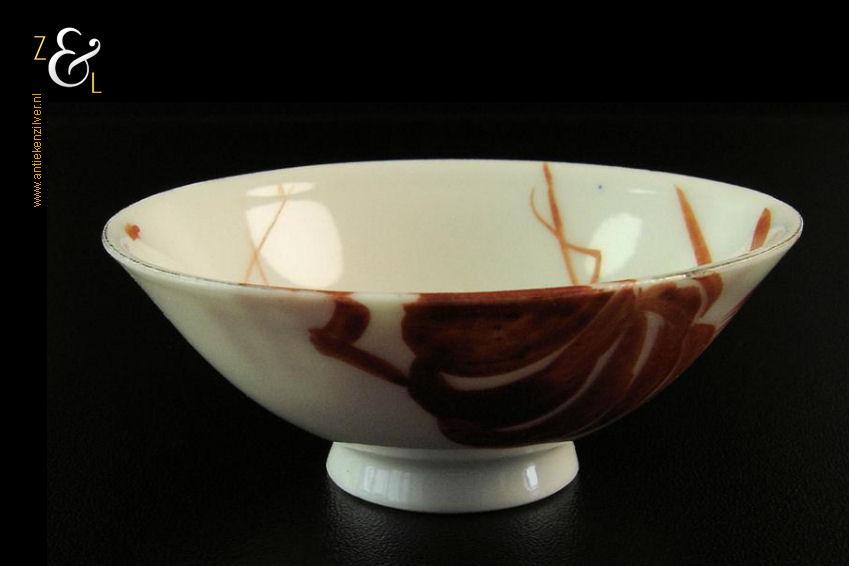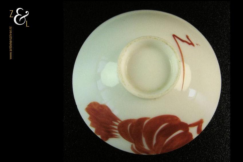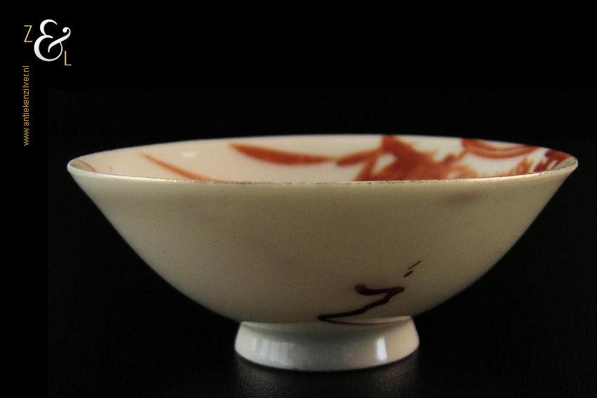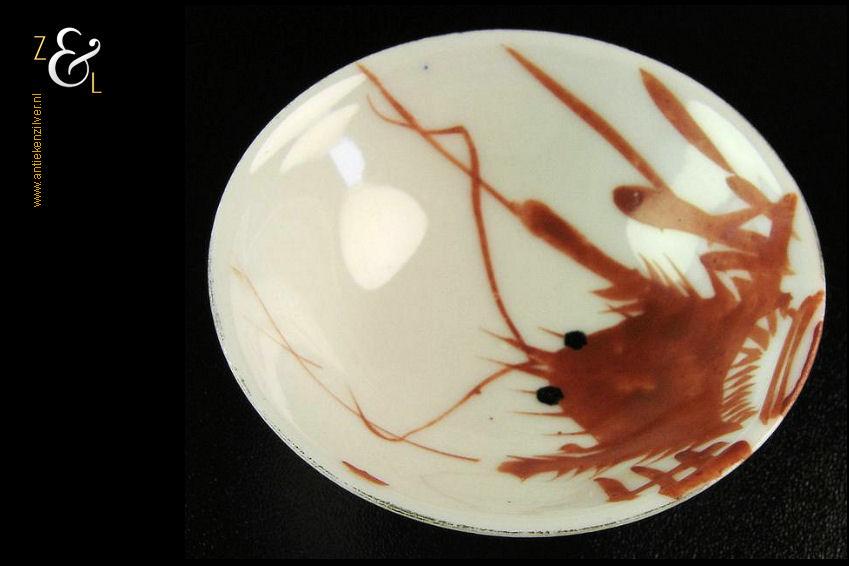 Dit Japanse met een garnaal gedecoreerde porseleinen sake kommetje stamt uit het eind van de 19e begin 20e eeuw, de zogenaamde Meiji periode die liep van 1868 tot 1912. Het kommetje is 2.7 cm hoog heeft een diameter van 7.1 cm en weegt 31 gram. Het leuke bij dit op de hand beschilderde kommetje is alsof de garnaal over de rand van het kommetje klimt.