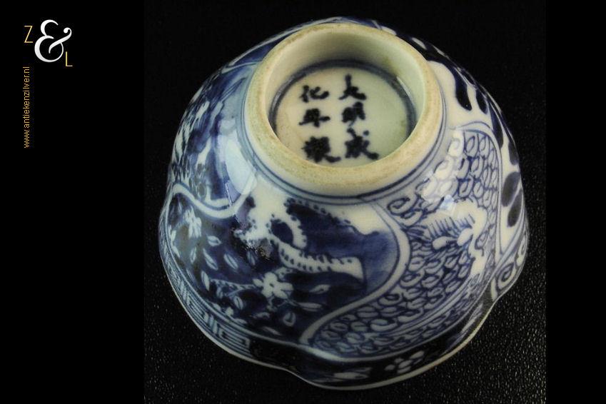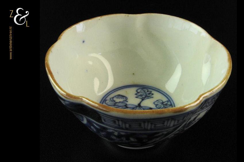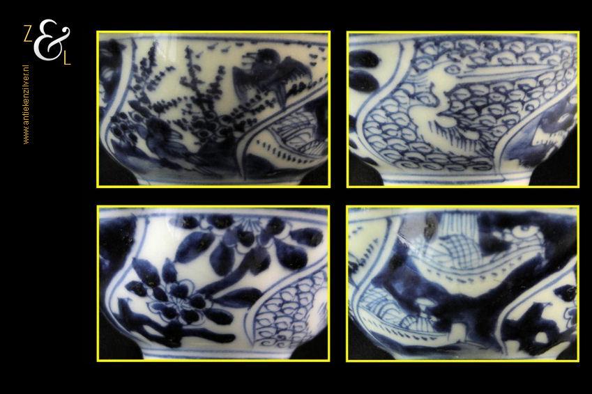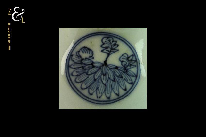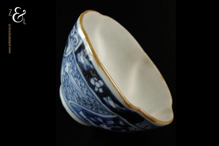 Dit Japanse rijk gedecoreerde blauw witte porseleinen sake kommetje stamt uit het eind van de 19e begin 20e eeuw, de zogenaamde Meiji periode die liep van 1868 tot 1912. Het is 3.6 cm hoog heeft een diameter van 6.5 cm en weegt 40 gram. Het kommetje is op de hand beschilderd met cartouches met daarin een voorstelling van twee vogels, twee Japanse vissersbootjes, lentebloesem en een pelikaan. Aan de onderzijde is dit kommetje gemerkt met een ons onbekende familienaam.