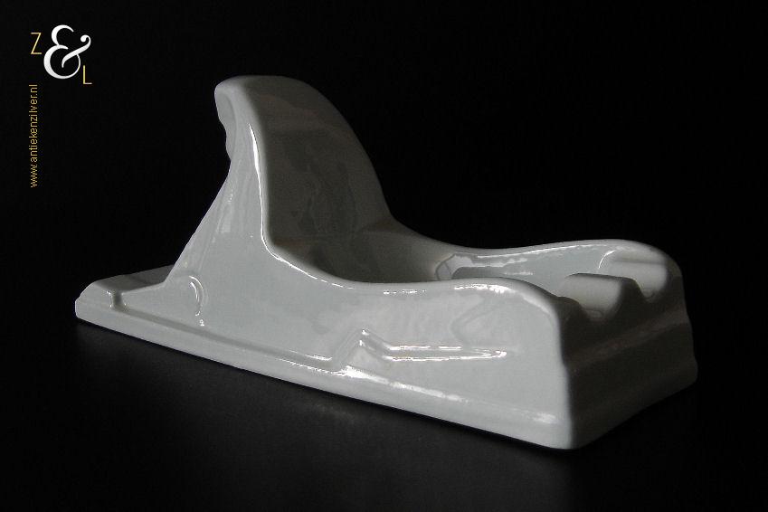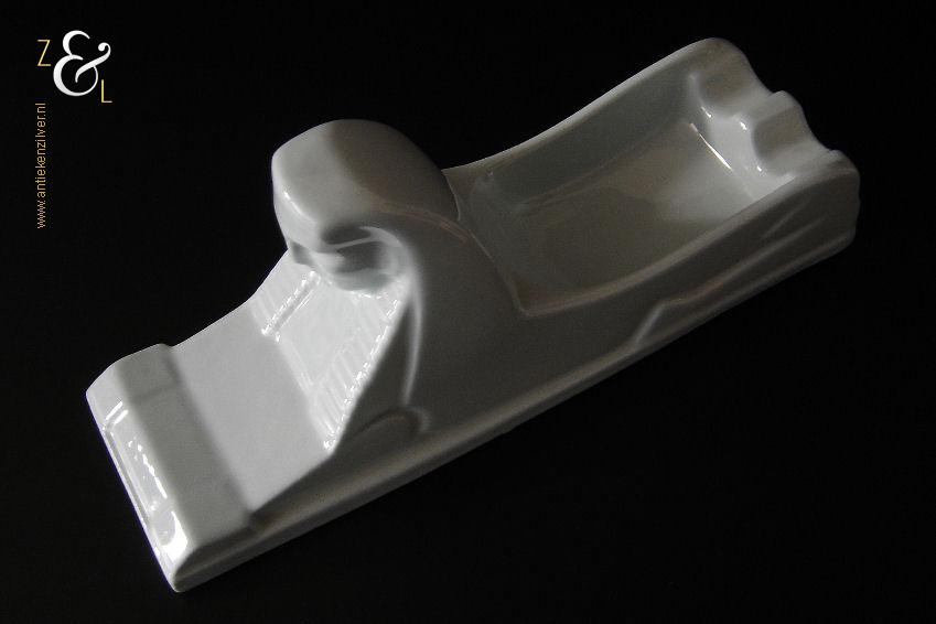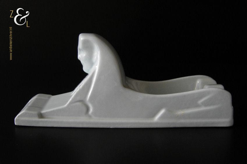 Deze asbak naar het ontwerp van Charles Vos is in de zestiger jaren bij P. Regout / Royal Sphinx* in Maastricht Holland gemaakt. De gestileerde licht blauwe in Art Deco stijl en in de vorm van een Sfinx* uitgevoerde asbak draagt aan de onderzijde het merkteken met: aan de bovenzijde een kroon, in het rond Royal Sphinx Maastricht, daaronder Made in Holland en in het midden de Sphinx met daaronder P. Regout, dat tussen 1948 en 2000 in gebruik was. De aardewerk asbak weegt 332 gram is 22 cm lang 7 cm breed 9 cm hoog. De kleur van de asbak is (pastel) lichtblauw en wijkt op de afbeeldingen iets af.