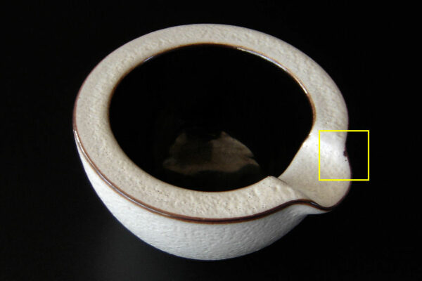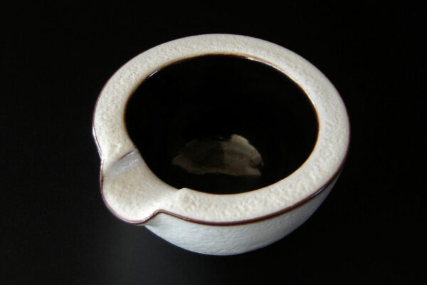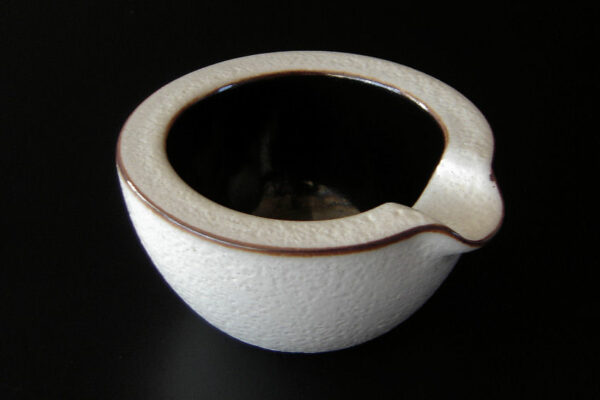 Deze asbak is gemaakt in Valkenburg provincie Zuid-Holland bij Potterie Ravelli naar een ontwerp van Jaap Ravelli. De aardewerk asbak is gemaakt in de vijftiger jaren en heeft een witte glazuur met een structuur / huid als een sinaasappelschil. De asbak waarvan de randen zijn geaccentureerd met een bruine glazuur heeft aan de binnenzijde een hoogglans zwarte glazuur. De asbak draagt aan de onderzijde in reliëf Ravelli met daarnaast het modelnummer 221. De asbak heeft een diameter van 9.3 cm is 4.8 cm hoog en weegt 265 gram. De asbak heeft een héél klein schilfertje aan de rand (zie geel omkaderd gedeelte op de afbeelding).