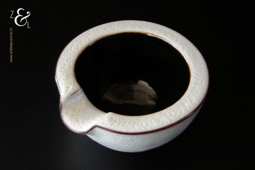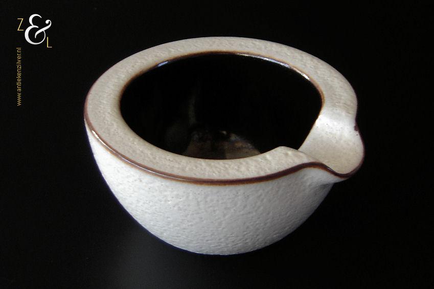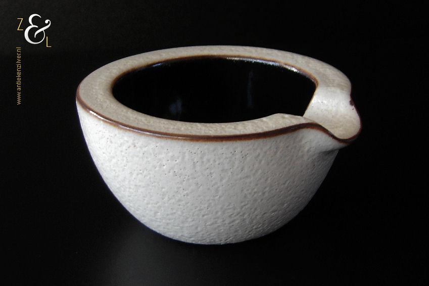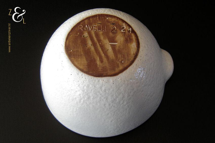 Deze asbak is gemaakt in Valkenburg provincie Zuid-Holland bij Potterie Ravelli naar een ontwerp van Jaap Ravelli. De aardewerk asbak is gemaakt in de vijftiger jaren en heeft een witte glazuur met een structuur / huid als een sinaasappelschil. De asbak waarvan de randen zijn geaccentureerd met een bruine glazuur heeft aan de binnenzijde een hoogglans zwarte glazuur. De asbak draagt aan de onderzijde in reliëf Ravelli met daarnaast het modelnummer 221. De asbak heeft een diameter van 9.3 cm is 4.8 cm hoog en weegt 265 gram. De asbak heeft een héél klein schilfertje aan de rand (zie geel omkaderd gedeelte op de afbeelding).