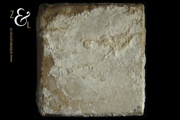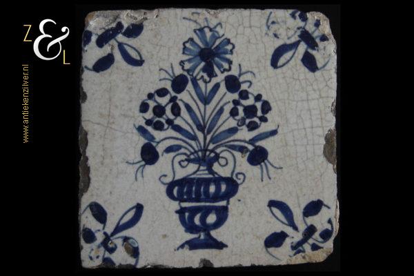Deze tegel is aan het einde van de 17e eeuw begin 18e eeuw gemaakt in Nederland. De op de hand beschilderde blauw witte tegel heeft in het midden de afbeelding van een bloemenvaas en de hoeken zijn gedecoreerd met het hoekmotief Franse lelie. De tegel weegt 285 gram meet 12.5 cm bij 12.5 cm en is 1.2 cm dik.