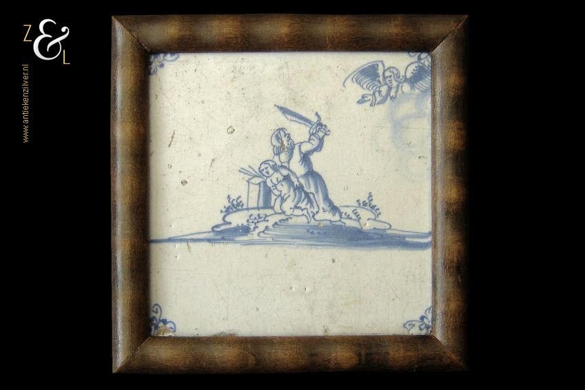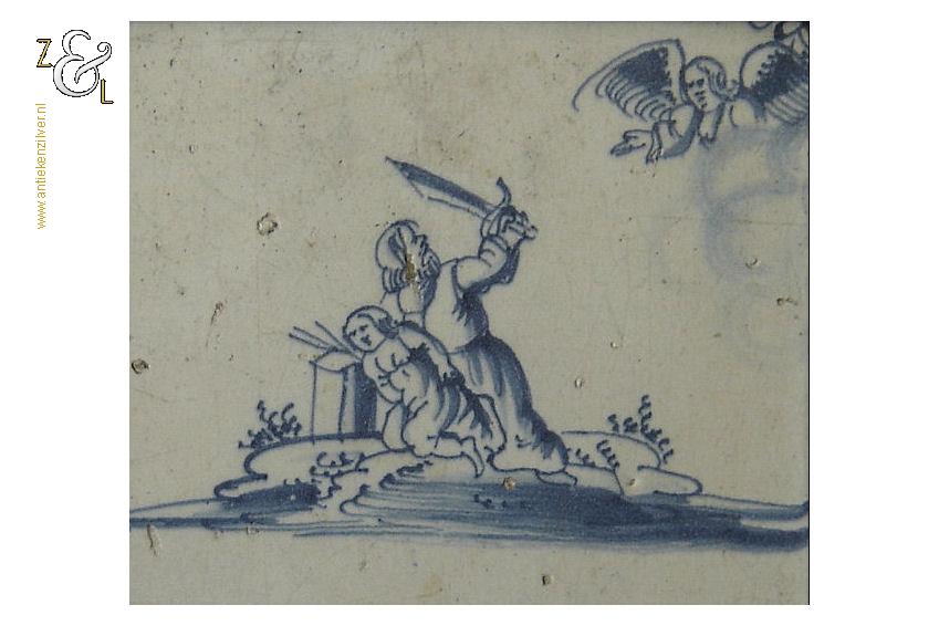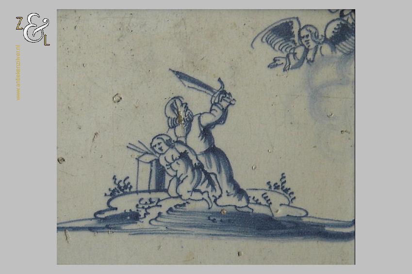 Deze (bijbel)tegel is in de 18e eeuw gemaakt in Nederland. De op de hand beschilderde blauw witte tegel heeft de religieuse bijbelse afbeelding van het offer van Abraham. Van de ingelijste tegel zijn de hoeken gedecoreerd met het hoekmotief spin. De tegel weegt 359 gram en is aan de buitenzijde van de lijst gemeten 15.2 cm bij 15.2 cm.