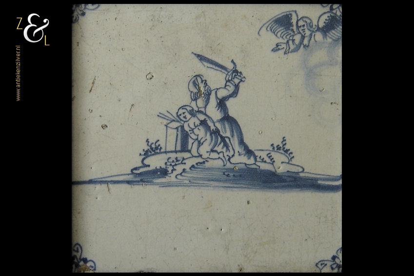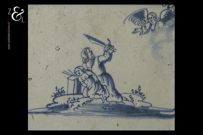 Deze (bijbel)tegel is in de 18e eeuw gemaakt in Nederland. De op de hand beschilderde blauw witte tegel heeft de religieuse bijbelse afbeelding van het offer van Abraham. Van de ingelijste tegel zijn de hoeken gedecoreerd met het hoekmotief spin. De tegel weegt 359 gram en is aan de buitenzijde van de lijst gemeten 15.2 cm bij 15.2 cm.