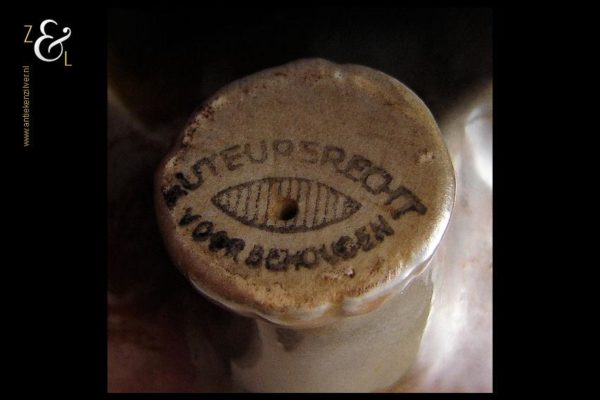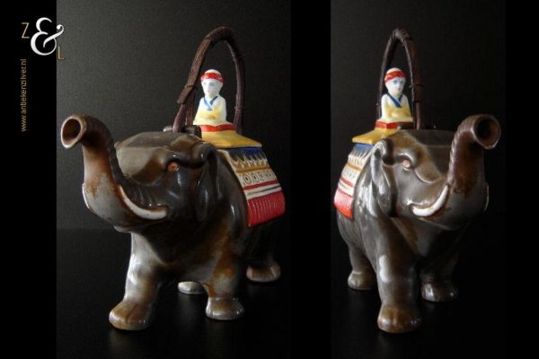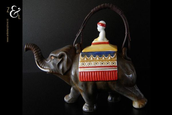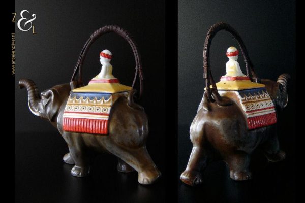 Deze aardewerken / platelen theepot in de vorm van een olifant is gemaakt bij Koninklijke Mosa in Maastricht. De olifant is uitgevoerd in grijs bruin en heeft zijn originele rieten hengsel. Aan de onderkant van een van de poten staat “auteursrecht voorbehouden” dit betekent: niets is toegestaan tenzij de auteur expliciet toestemming geeft. De theepot weegt 750 gram is 27 cm lang 10.8 cm breed en 19 cm hoog.
