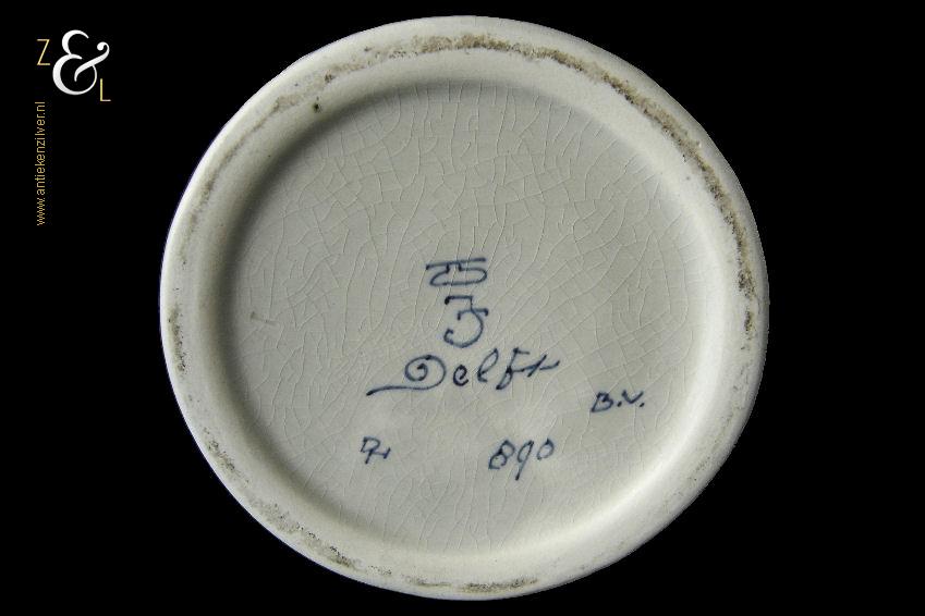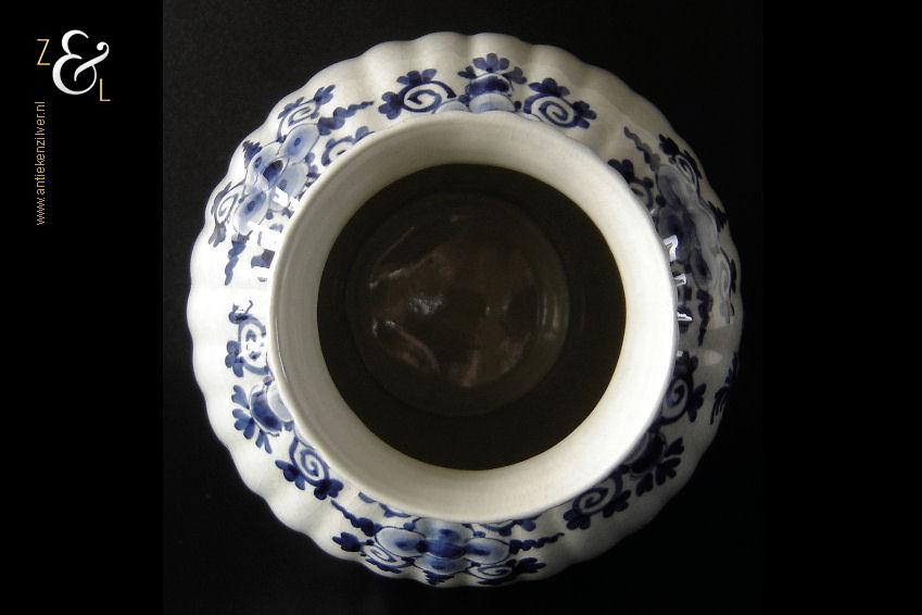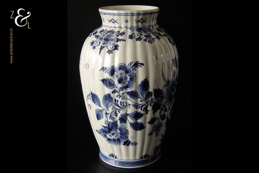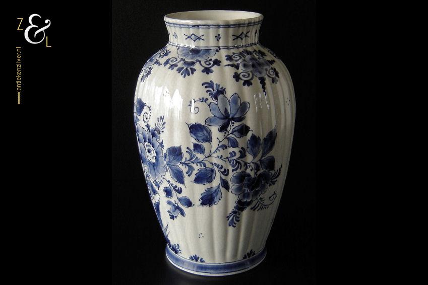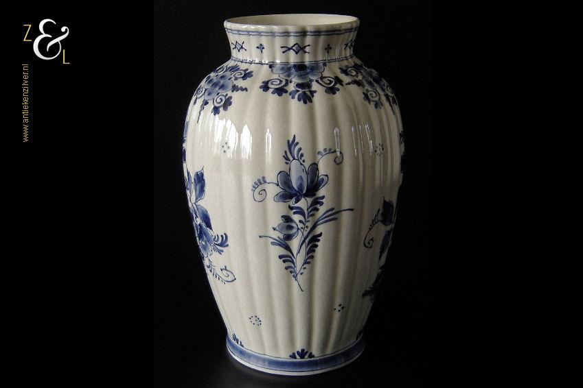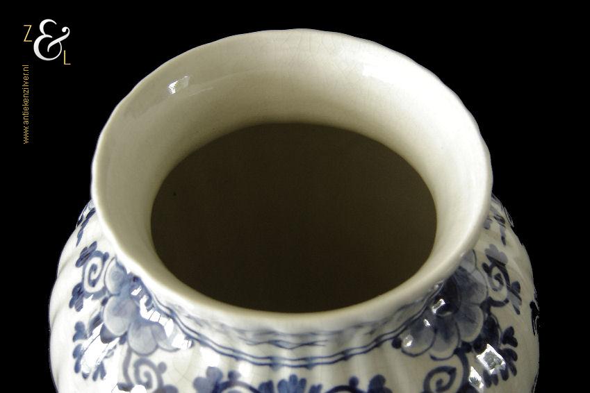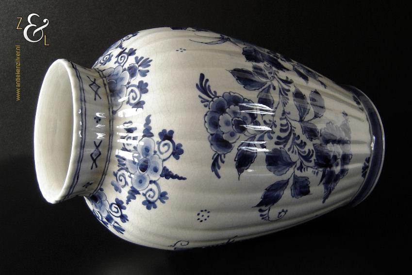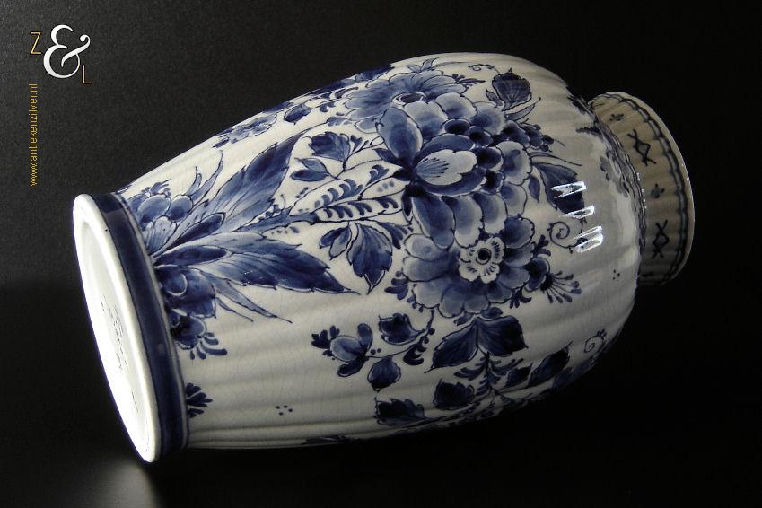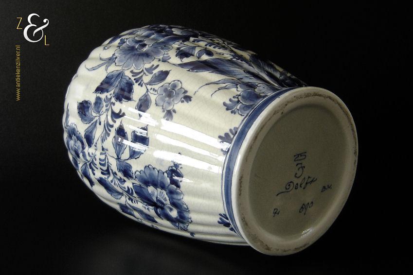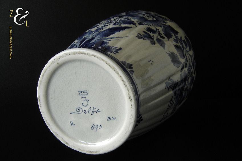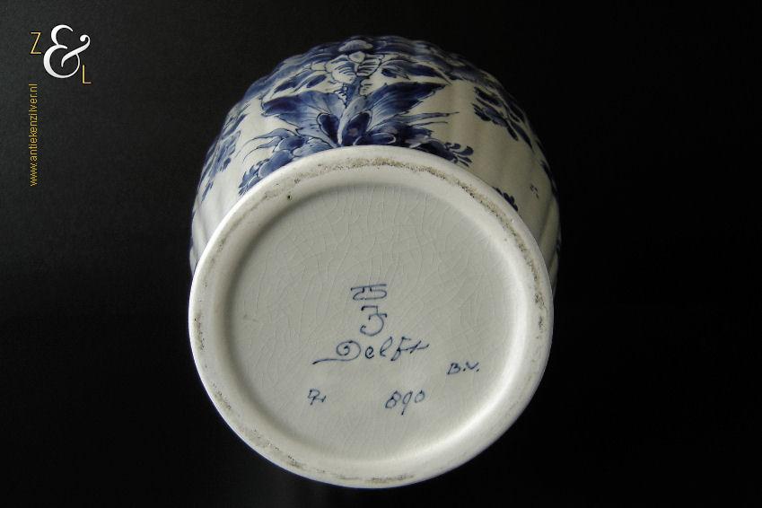 Deze vaas / ribbelvaas is gemaakt in Delft bij de aardewerkfabriek De Porceleyne Fles / Royal Delft. De op de hand gemaakte en beschilderde tinglazuur / onderglazuur aardewerk vaas is rondom voorzien van een kobaltblauw-wit decor met de afbeelding van florale motieven. De vaas is aan de onderzijde met de kleur blauw gesigneerd en gecodeerd met: bovenaan een apothekersflesje, daaronder de initialen JT, van Joost Thooft (eigenaar van het bedrijf in 1876) en daaronder Delft. Onder het merk staat links het monogram van de schilder: een ineengevlochten D en N voor D.R. v.d. Niet, in dienst van 1949 tot en met 1959 rechts: de jaarcode B.V. voor 1951 en middenonder: het modelnummer 890. De vaas weegt 1309 gram is 25.7 cm hoog en heeft een diameter van 16.5 cm. De opening aan de bovenzijde heeft een diameter van 9.7 cm en de voet heeft een diameter van 11 cm. De vaas heeft héél lichte gebruikssporen en een egale craquelé.