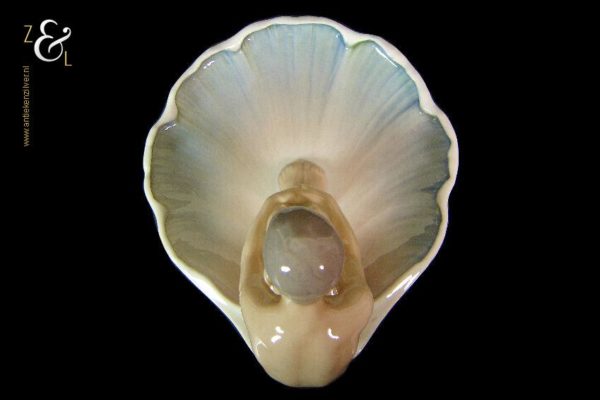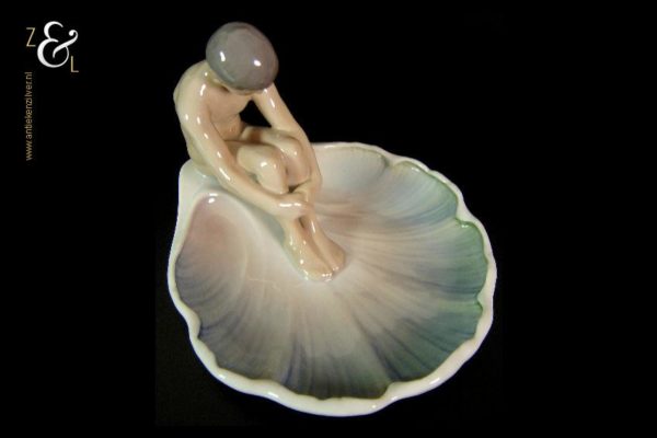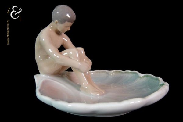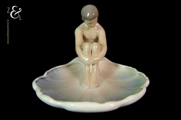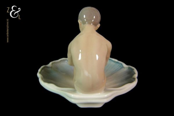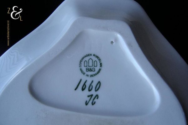 Dit porseleinen beeld / plastiek model “Reflecties” (van een naakte jongen zittend op een schelp kijkend naar zijn reflectie) is gemaakt bij Bing & Grondahl te Denemarken. Aan de onderzijde is het beeld / plastiek in groen gemerkt met drie torens met daaronder B&G (Bing & Grondahl) en rondom Copenhagen Porcelain made in Denmark (dit merk werd door Bing & Grondahl gebruikt tussen 1970 en 1983) en het modelnummer 1660. Tevens is het beeld / plastiek gesigneerd met JC dit is de schilder die het beeld / plastiek gedecoreerd heeft. Het beeld / plastiek weegt 889 gram is 22.1 cm lang 19.2 cm breed en 14.3 cm hoog.