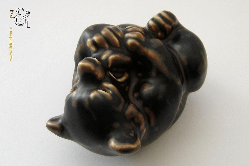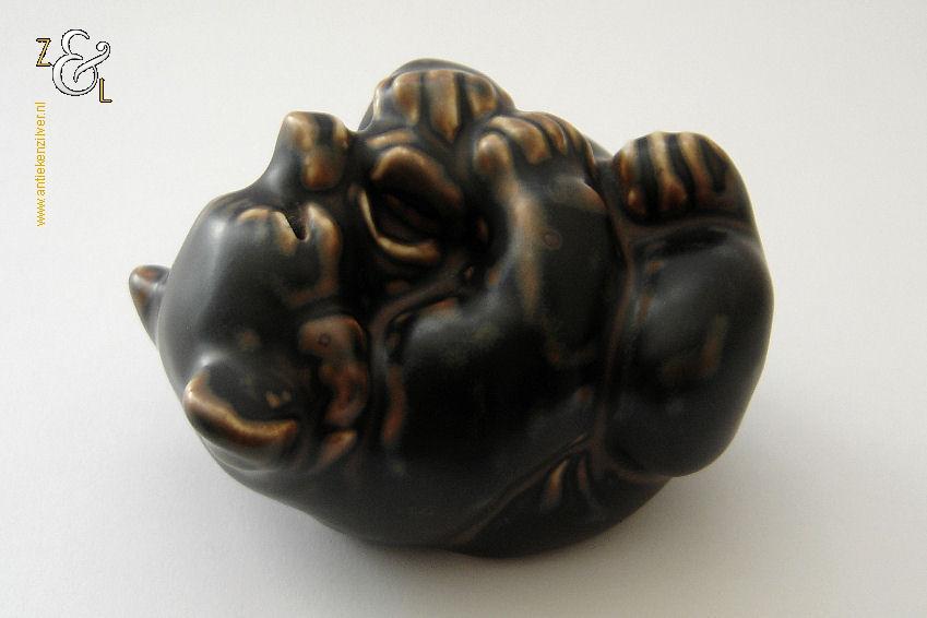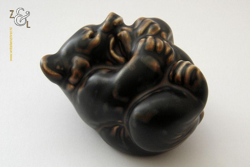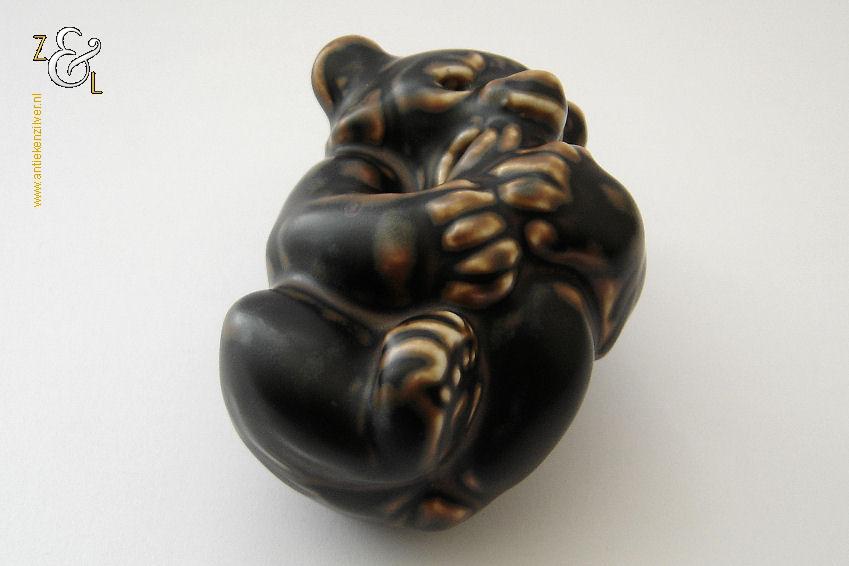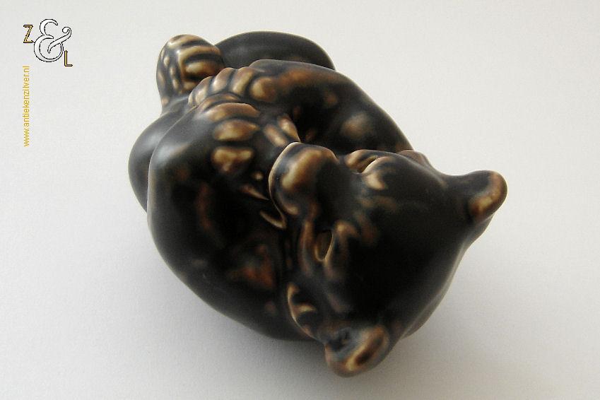 Dit beeld / plastiek van een spelende bruine beer welp die liggend op zijn rug aan zijn poot sabbelt is uitgevoerd in geglazuurd gres aardewerk. Aan de onderzijde is de beer gemerkt met in het blauw modelnummer 21434, met daaronder in het groen DENMARK, de drie blauwe golven die symbool staan voor de Sont, de Grote Belt en de Kleine Belt de zeestraten die tussen de Deense eilanden lopen en tevens het merk voor de porseleinfabriek Royal Copenhagen te Denemarken is en het blindmerk KK voor de ontwerper Knud Kyhn. Het beeld / plastiek weegt 183 gram is 8.3 cm lang 6 cm breed en 5.7 cm hoog.