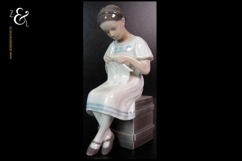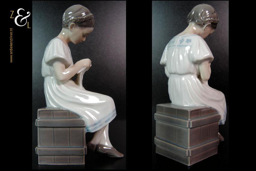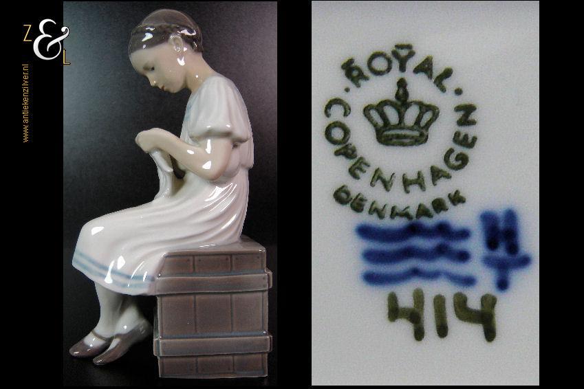 Dit porseleinen beeld / plastiek model “Grethe” (van een Breiend meisje zittend op een kist) is gemaakt bij Royal Copenhagen te Denemarken. Aan de onderzijde is het beeld / plastiek in groen gemerkt met het modelnummer 414 en het merk Royal Copenhagen Denmark met een streepje boven de R en Y van Royal dat staat voor het jaar van productie dat tussen 1992 en 1999 ligt. Tevens is het beeld / plastiek in blauw gesigneerd met HT dit is de schilder* die het beeld / plastiek gedecoreerd heeft en het drie golven merk die symbool staan voor de Sont, de Grote Belt en de Kleine Belt de zeestraten die tussen de Deense eilanden lopen. Aan de achterzijde van het beeld / plastiek aan de onderkant van de kist staat de naam van de ontwerper Ingeborg Plockross*. Het beeld / plastiek weegt 348 gram is 9.5 cm lang 7.2 cm breed en 17.3 cm hoog.