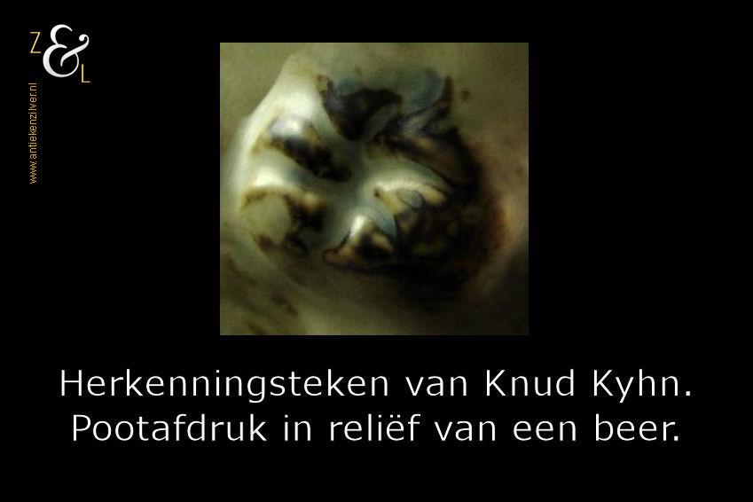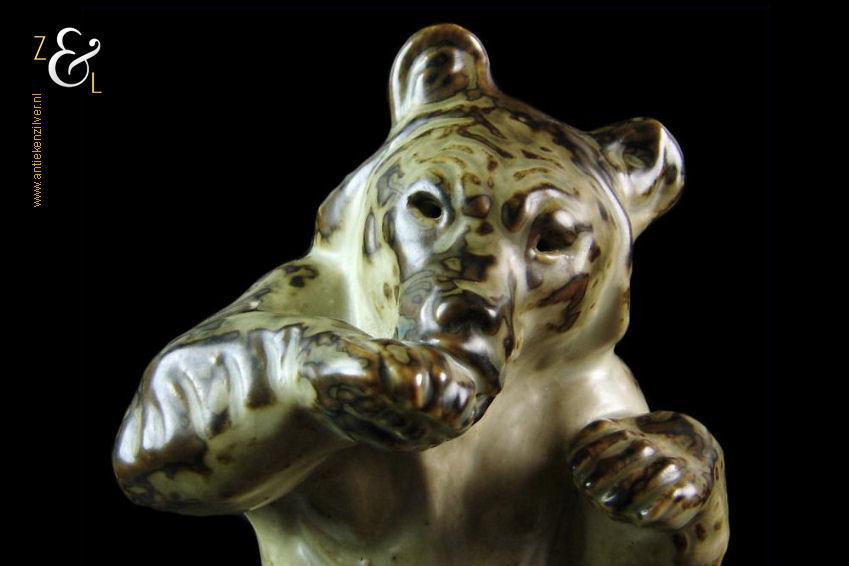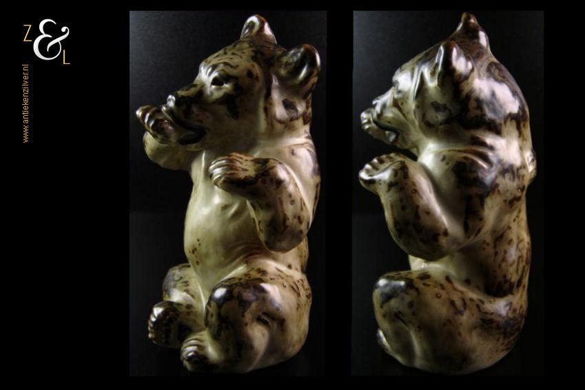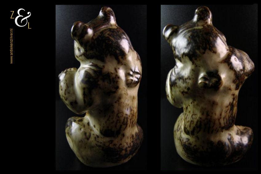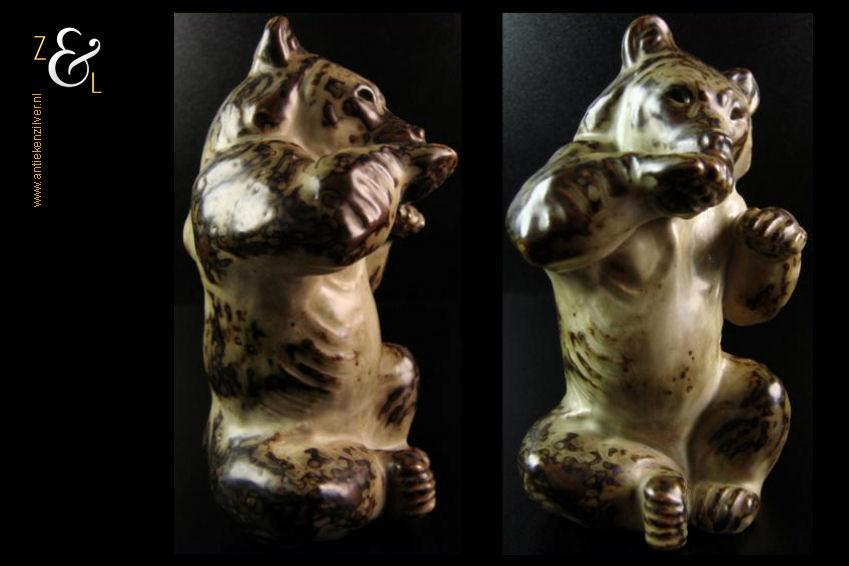 Dit beeld / plastiek van een zittende bruine beer die honing van zijn poot likt is uitgevoerd in geglazuurd gres aardewerk. Aan de onderzijde is de beer gemerkt met het modelnummer 21675, de drie blauwe golven die symbool staan voor de Sont, de Grote Belt en de Kleine Belt de zeestraten die tussen de Deense eilanden lopen en tevens het merk voor de porseleinfabriek Royal Copenhagen te Denemarken is en het blindmerk KK voor de ontwerper Knud Kyhn. Tevens heeft de beer op de vacht van zijn rug in reliëf een pootafdruk van een beer waaraan je het ontwerp van Knud Kyhn kan herkennen. Het beeld / plastiek is een ontwerp uit 1967 en is niet meer in productie. Het beeld / plastiek weegt 792 gram is 10 cm lang 9 cm breed en 17.8 cm hoog.