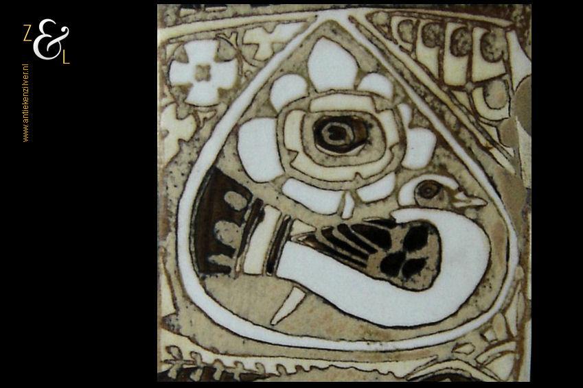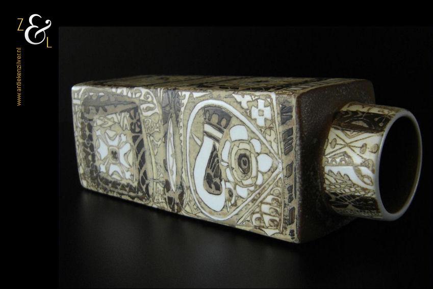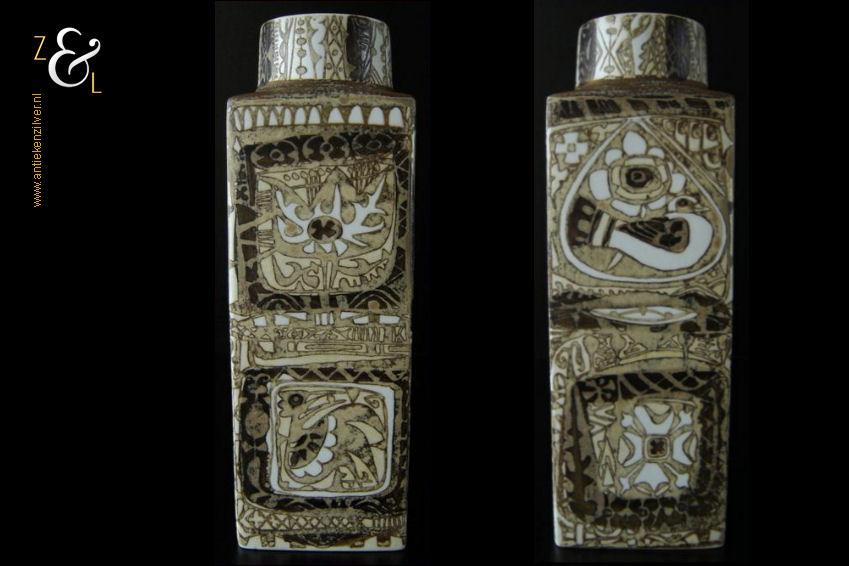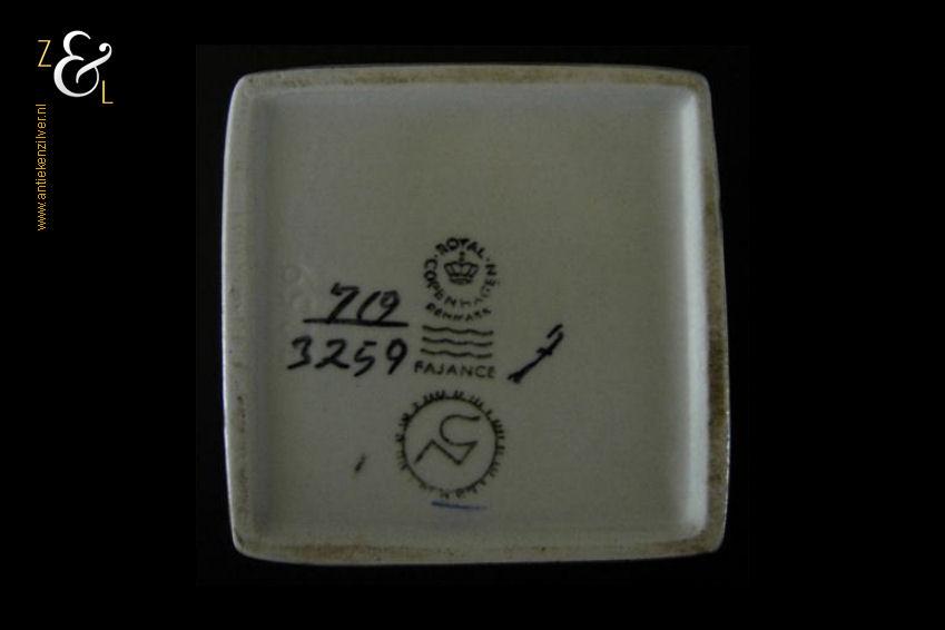Deze vaas met vogel mozaïek afbeeldingen is gemaakt bij Royal Copenhagen te Denemarken, de fajance vaas die behoort tot de zogenaamde BACA serie is een klassieker die stamt uit de zeventiger jaren en is ontworpen door de beroemde Deense aardewerk en porselein ontwerper Nils Johan Thorvald Thorsson. Aan de onderzijde is de vaas gemerkt met Royal Copenhagen Denmark, Fajance, het decoratienummer 719/3259 en in een cirkel de initialen van Nils Thorsson. De vaas weegt 697 gram is 22.2 cm hoog en heeft een lengte van 8 cm en is 8 cm breed.