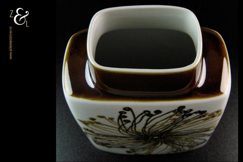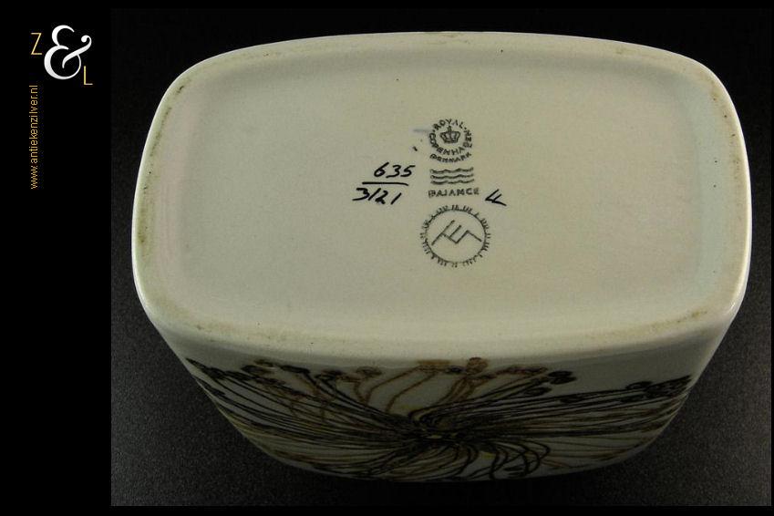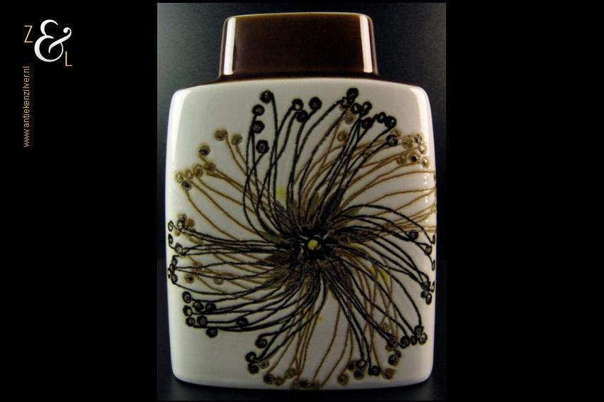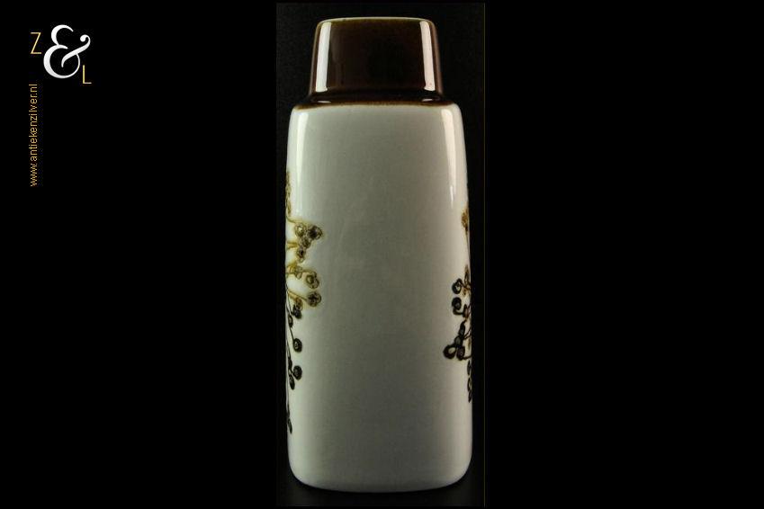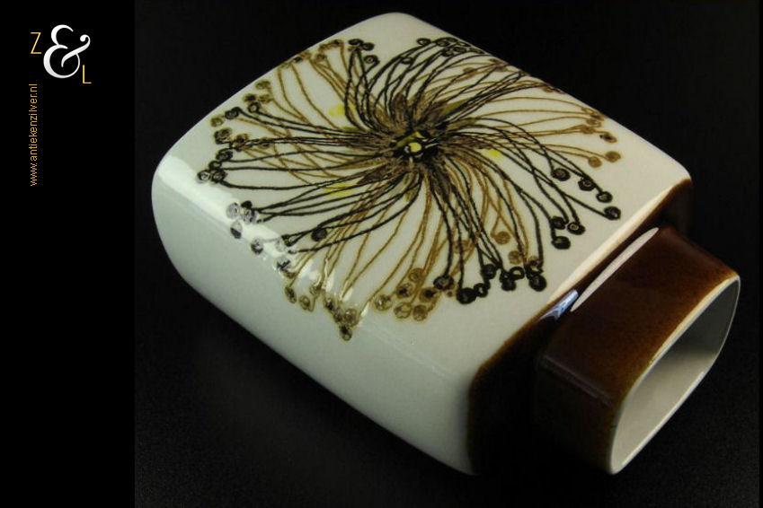 Deze zogenaamde kussenvaas met daarop de afbeelding van een gestileerde bloem en met een koffiebruine hals is gemaakt bij Royal Copenhagen te Denemarken, de fajance vaas die behoort tot de zogenaamde BACA serie is een klassieker die stamt uit de late zestiger jaren begin zeventiger jaren en is ontworpen door de beroemde Deense aardewerk en porselein ontwerper Ellen Malmer. Aan de onderzijde is de vaas gemerkt met Royal Copenhagen Denmark, Fajance, het decoratienummer 635/3121 en in de BACA cirkel de initialen van Ellen Malmer. De vaas weegt 721 gram en is cm 19 cm hoog 8.8 cm breed en 14.6 cm diep.