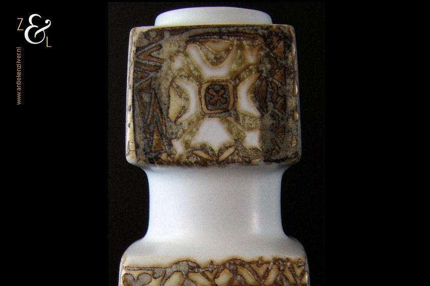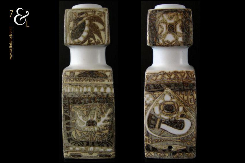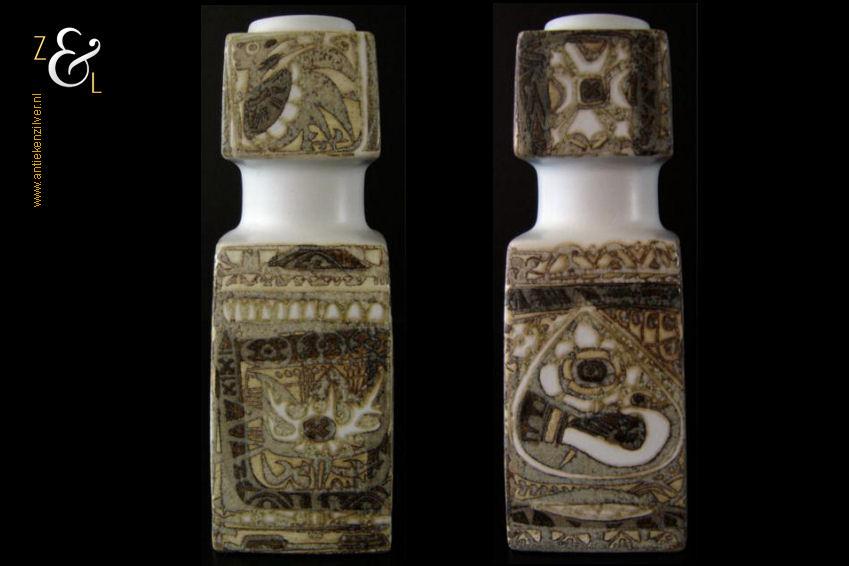 Deze vaas / lampvoet met vogel mozaïek afbeeldingen is gemaakt bij Royal Copenhagen te Denemarken, de fajance vaas die behoort tot de zogenaamde BACA serie is een klassieker die stamt uit de zeventiger jaren en is ontworpen door de beroemde Deense aardewerk en porselein ontwerper Nils Johan Thorvald Thorsson. Aan de onderzijde is de vaas gemerkt met Royal Copenhagen Denmark, Fajance, het decoratienummer 92/7193, FOG & MORUP (een firma die exclusieve design lampen verkocht) en in een cirkel de initialen van Nils Thorsson. De vaas weegt 503 gram is 20.2 cm hoog en heeft een lengte van 7 cm en is 7 cm breed.