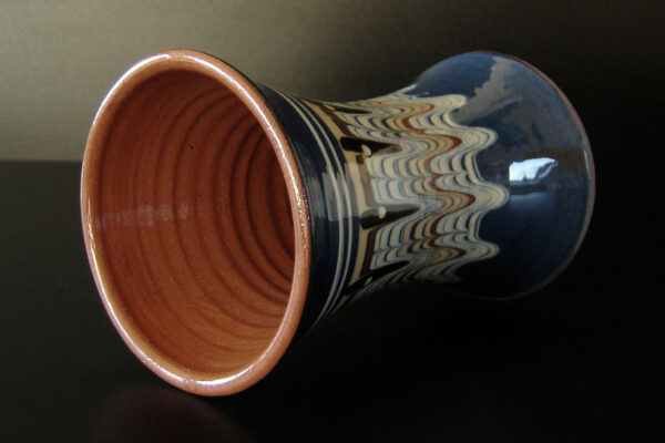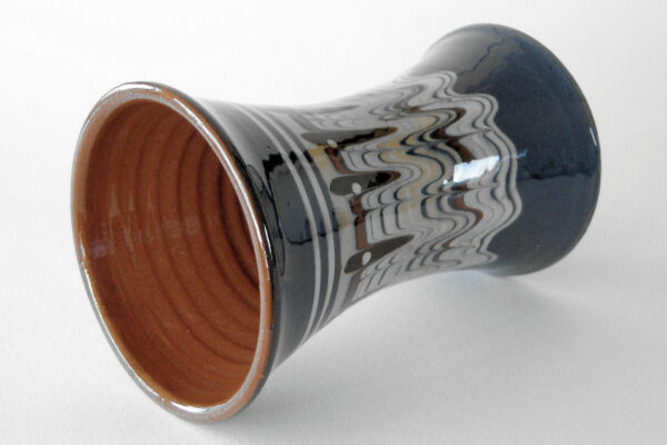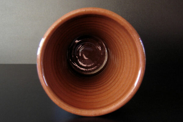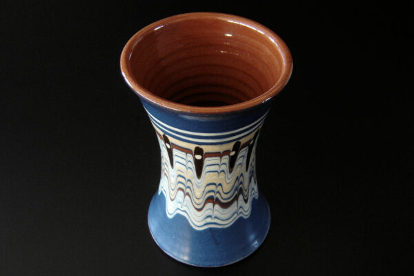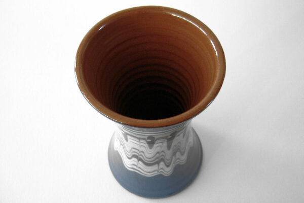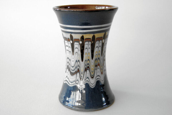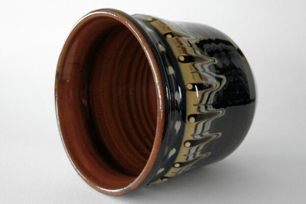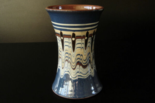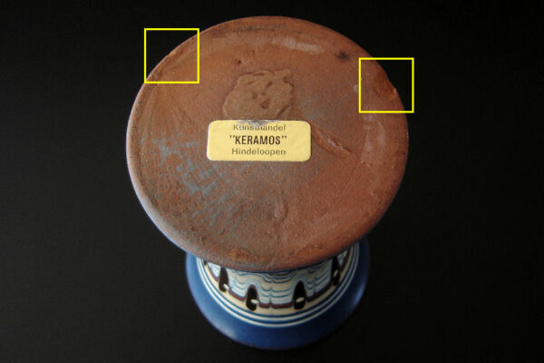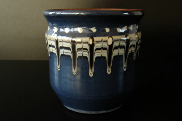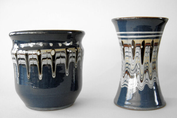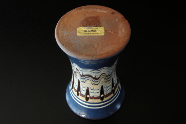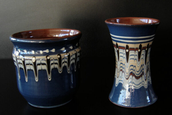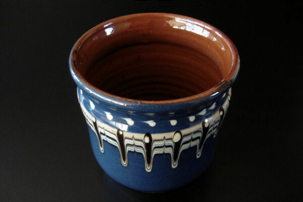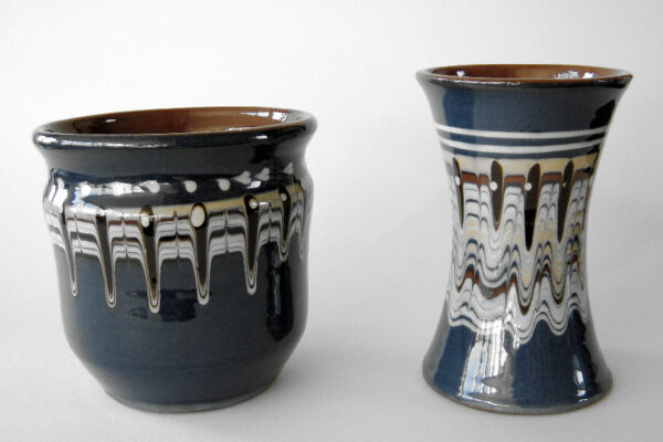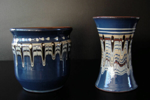 Deze vaas en bloempot zijn gemaakt in de plaats Trojan / Troyan Bulgarije en verkocht in Nederland door Kunsthandel Keramos in Hindeloopen (zie etiket op afbeelding). De aardewerk vaas en bloempot die uit de zestiger- zeventiger jaren stammen zijn op de hand gedraaid van roodkleurige klei en gedecoreerd met een druppelglazuur. De vaas heeft een diameter van 9.3 cm is 14.2 cm hoog en weegt 425 gram. De bloempot heeft een diameter 12.5 cm is 12.2 cm en weegt 652 gram. De vaas heeft aan de onderzijde een héél kleine en een kleine chip (zie geel omkaderde gedeeltes op afbeelding) deze zijn niet te zien als de vaas op zijn voet staat.