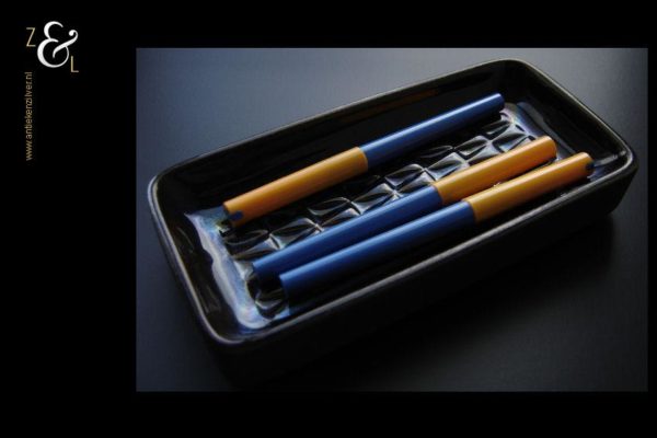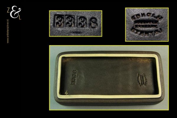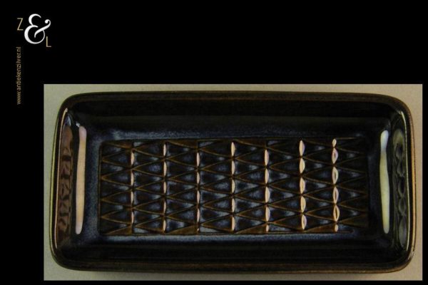 Dit rechthoekige keramische presenteerschaaltje met een glanzende blauwe en bruine glazuur is geproduceerd bij de Søholm Stentøj fabriek te Bornholm Denemarken. Het schaaltje is onderdeel van de blauwe serie EJ64 en is aan de onderzijde gestempeld met Søholm Stentøj Denemarken en het nummer 3338. Deze in 1964 door Einar Johansen ontworpen serie was Søholms grootste succes ooit. Het schaaltje is 18.5 cm lang 9.5 cm breed en 3 cm hoog en weegt 439 gram. Het presenteerschaaltje kan bijvoorbeeld ook gebruikt worden op het bureau als pennenbakje.