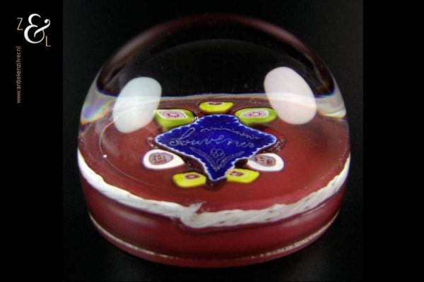 Deze presse papier is gemaakt in België bij de glasblazerij Val Saint Lambert en stamt uit de 19e eeuw. In het midden van de presse papier staat op een blauwe achtergrond het woord Souvenir geschreven. Daaromheen zijn zeven stukjes millefiori* gebruikt. De presse papier heeft een rode achtergrond met rondom een witte kabel. De presse papier heeft een hoogte van 6 cm een diameter van 8.5 cm en hij weegt 896 gram.