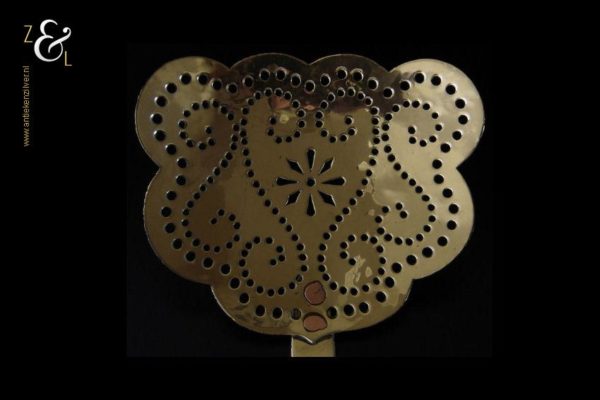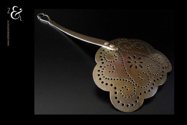 Deze messing roomafschuimer of melkspaan (creamstrainer of skinner) is gemaakt in Engeland tijdens de tweede helft van de 18e eeuw de Georgian periode die liep van 1714 tot 1830. De roomafschuimer of melkspaan is geheel op de hand gesmeed, de steel heeft een licht gehamerd oppervlakte en de schep en de steel zijn met roodkoperen nagels aan elkaar vastgeklonken. De steel is voorzien van een oog, dit omdat het in de 18e en 19e eeuw gewoonte was dat al het keukengerei werd opgehangen. De achterzijde van de spaan is niet gepoetst en heeft nog zijn originele patina. De roomafschuimer of melkspaan weegt 400 gram is 46.5 cm lang en de schep meet 19.3 cm bij 16 cm.