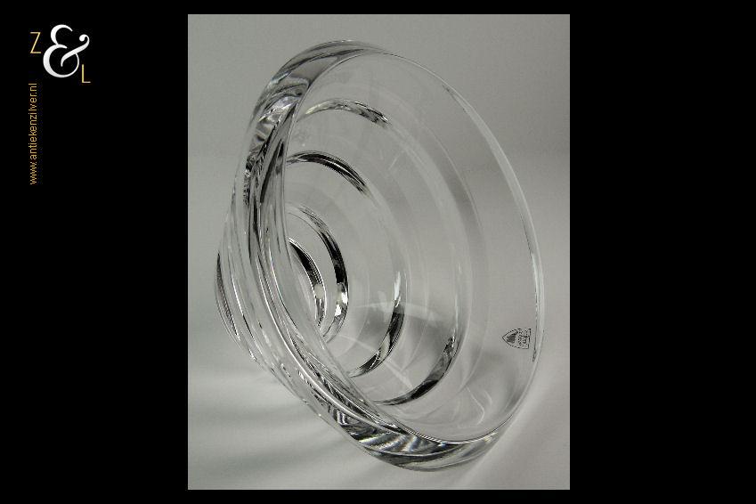 Deze in helder kristal uitgevoerde schaal is gemaakt in Zweden bij de glasblazerij Orrefors Crystal naar een ontwerp uit 2010 van Lena Bergström. De schaal model Swing is aan de onderzijde gesigneerd met Orrefors LB 65350-12. De schaal weegt 1253 gram heeft een diameter van 17.8 cm en is 10.1 cm hoog.