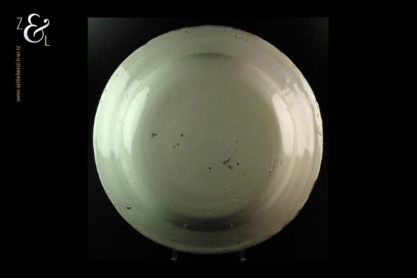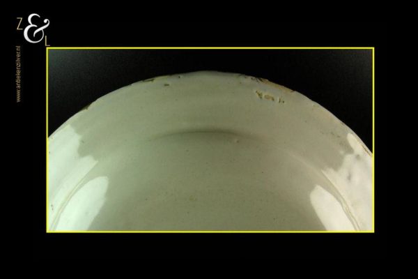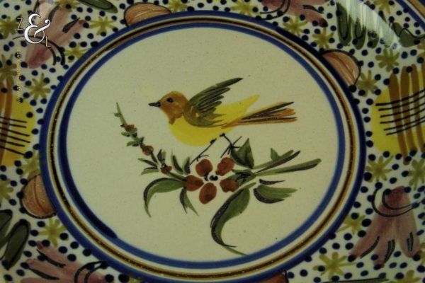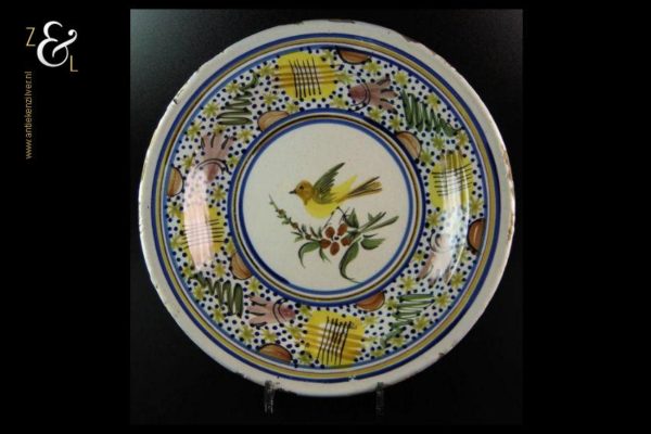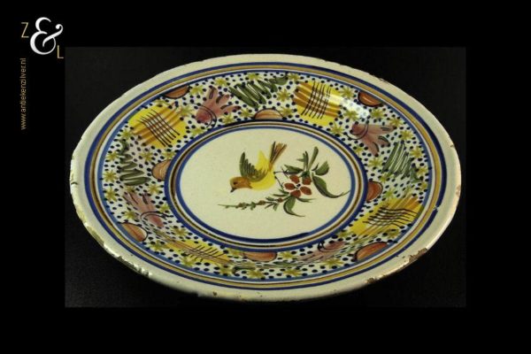 Deze op de hand beschilderde Majolica schotel met een vogel zittend op een bloemtak stamt uit de 19e eeuw. De veelkleurige schotel die zowel aan de voor- als achterzijde geglazuurd is heeft randschade wat inherent is aan dit soort antieke schotels (vaak ontstond deze schade al tijdens het bakproces). De schotel weegt 1195 gram heeft een diameter van 34.5 cm en is 4.2 cm hoog. De schotel wordt verkocht exclusief bordenstandaard.
