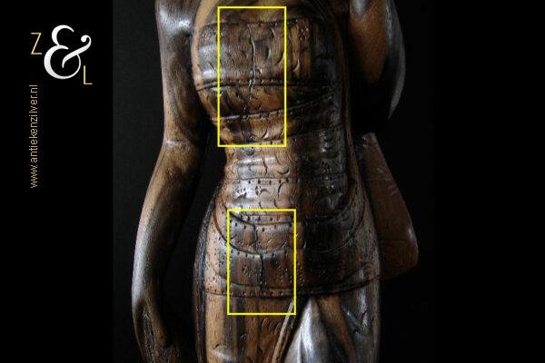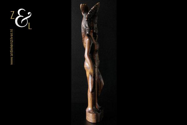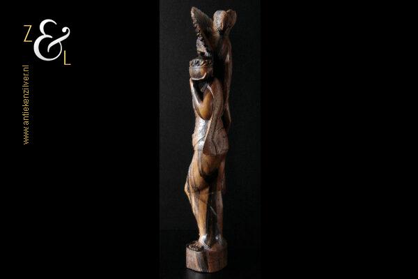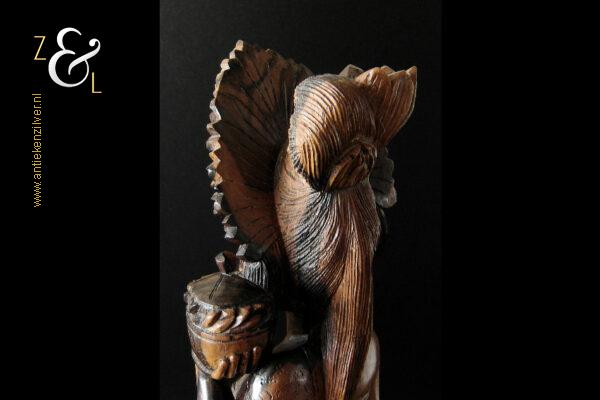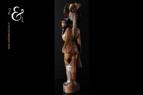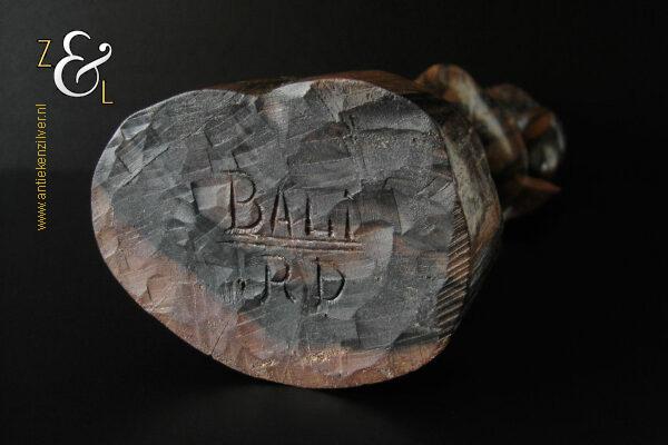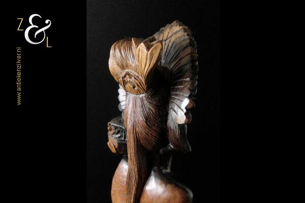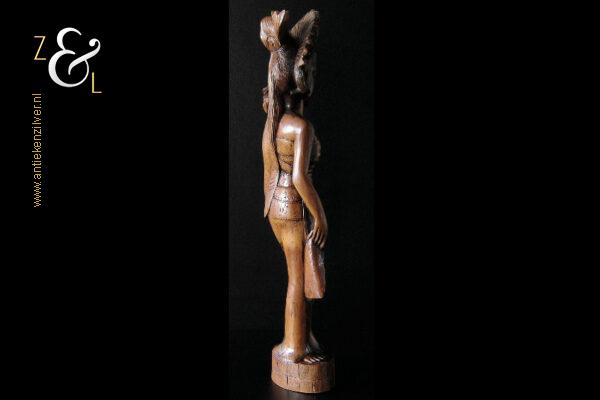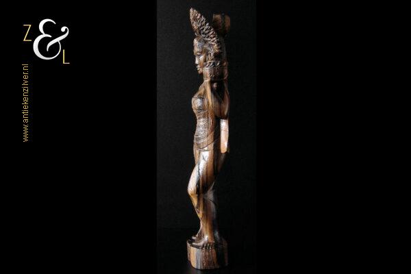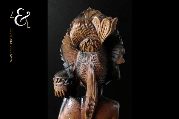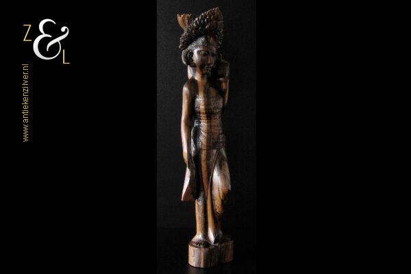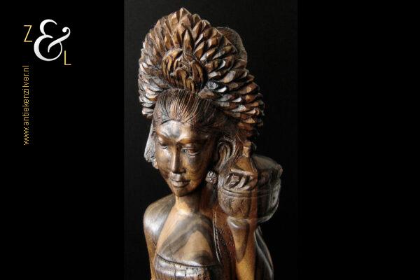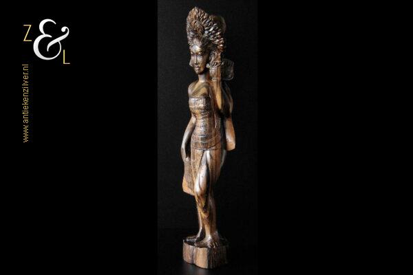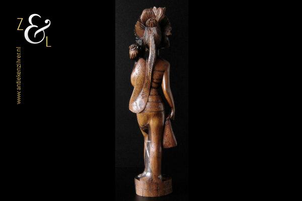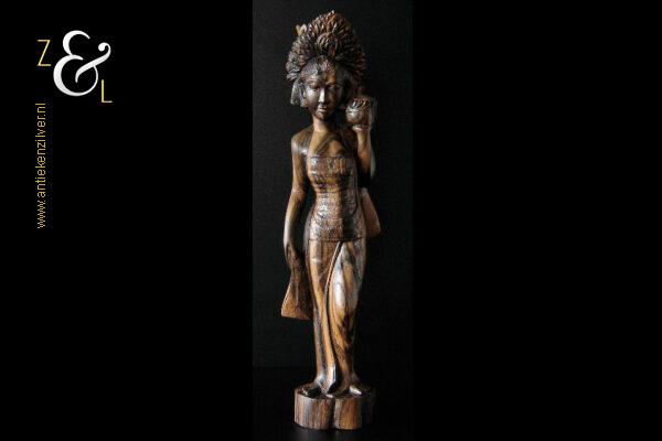 Dit coromandelhouten sculptuur is omstreeks de jaren vijftig gemaakt op het eiland Bali Indonesië. Het sculptuur heeft de voorstelling van een traditioneel geklede Balinese vrouw die in haar linkerhand een fruitmand / fruitschaal met deksel draagt. In de oren heeft ze grote subeng (oorsieraden) en op haar hoofd een hoofdtooi met aan de achterzijde daarvan opgestoken haar met een paardenstaart. Het uit één stuk op de hand gesneden coromandelhouten sculptuur is aan de onderzijde gesigneerd RD met daarboven de tekst Bali en weegt 1573 gram en is 49.7 cm hoog. Het sculptuur heeft aan de oppervlakte van het harde coromandelhout twee scheurtjes (zie geel omkaderde gedeeltes op afbeelding).