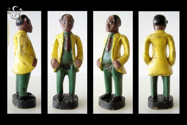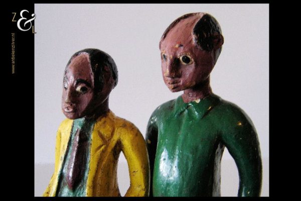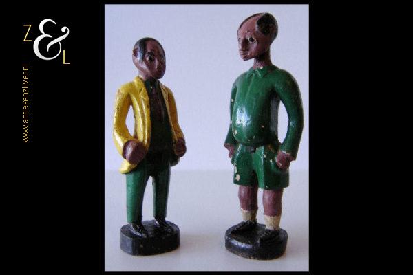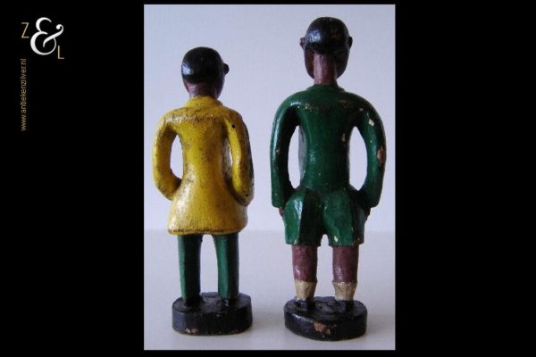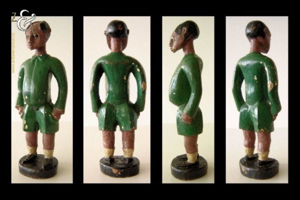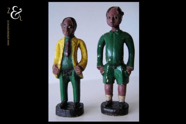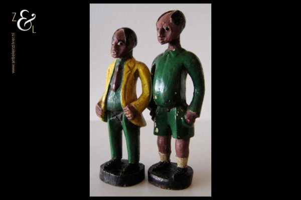 Deze twee beschilderde houten beeldjes van een voetballer en zijn trainer zijn omstreeks de jaren vijftig gemaakt in Kenia Afrika. De zéér decoratieve beeldjes die onder volkskunst* vallen wegen samen 507 gram. De voetballer is 26.5 cm hoog en de trainer is 24.4 cm hoog.