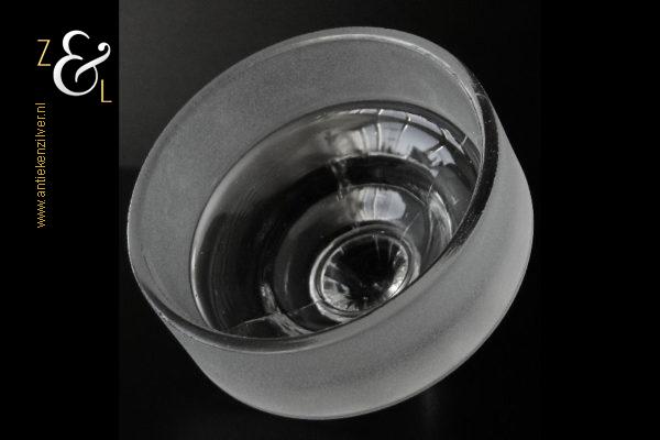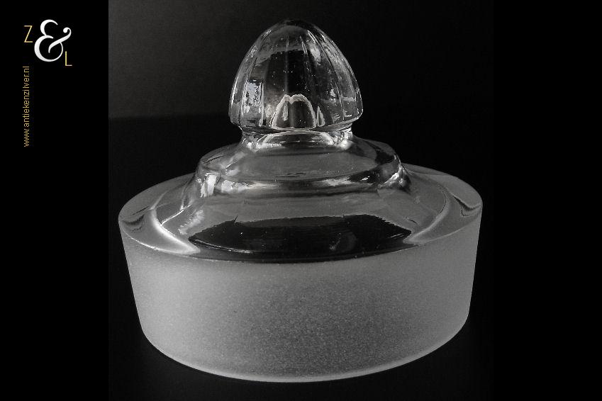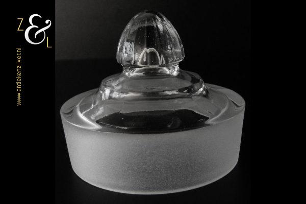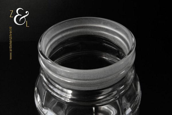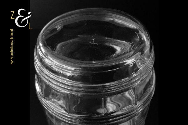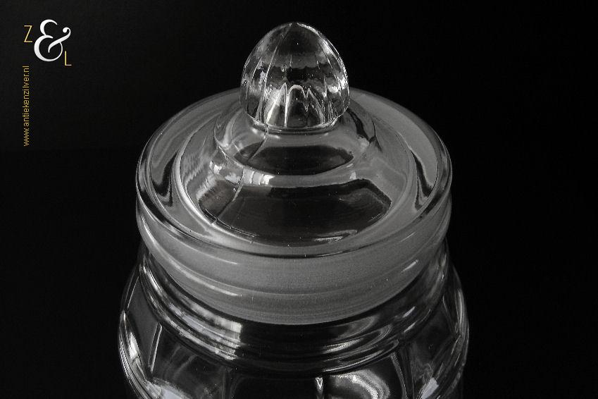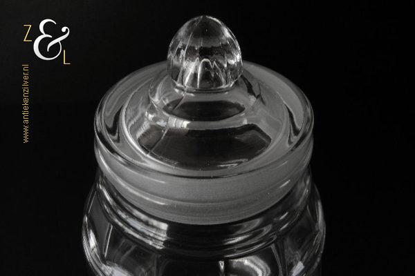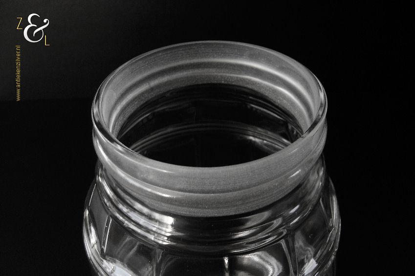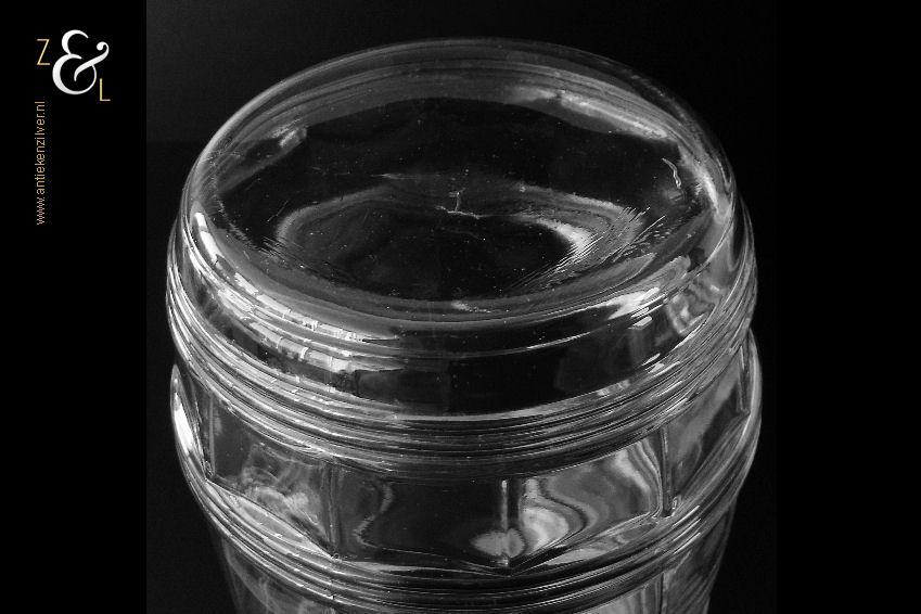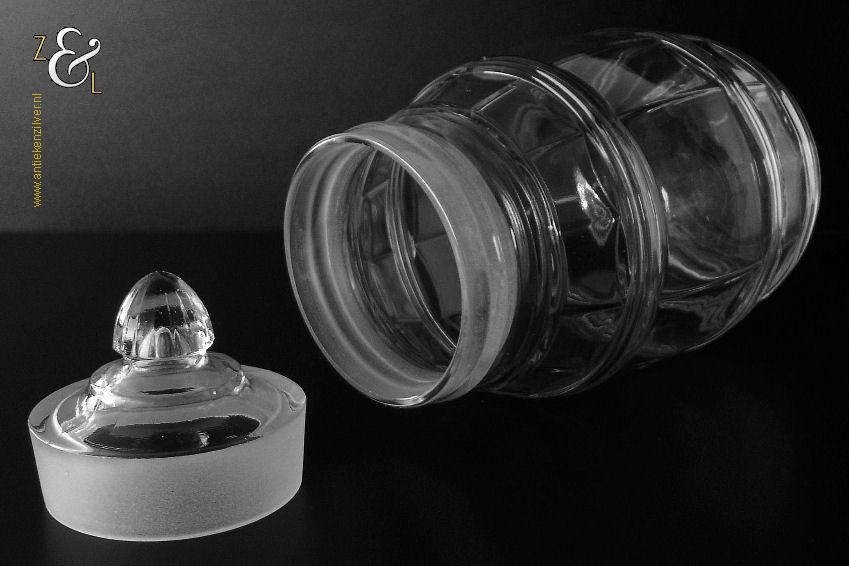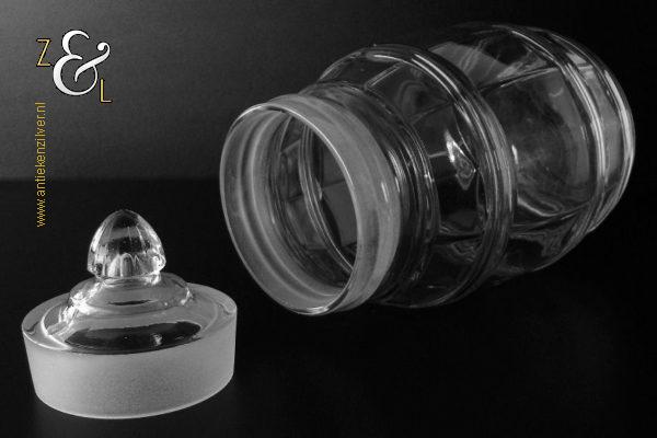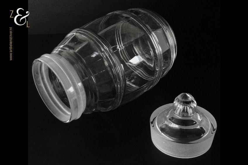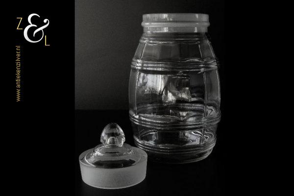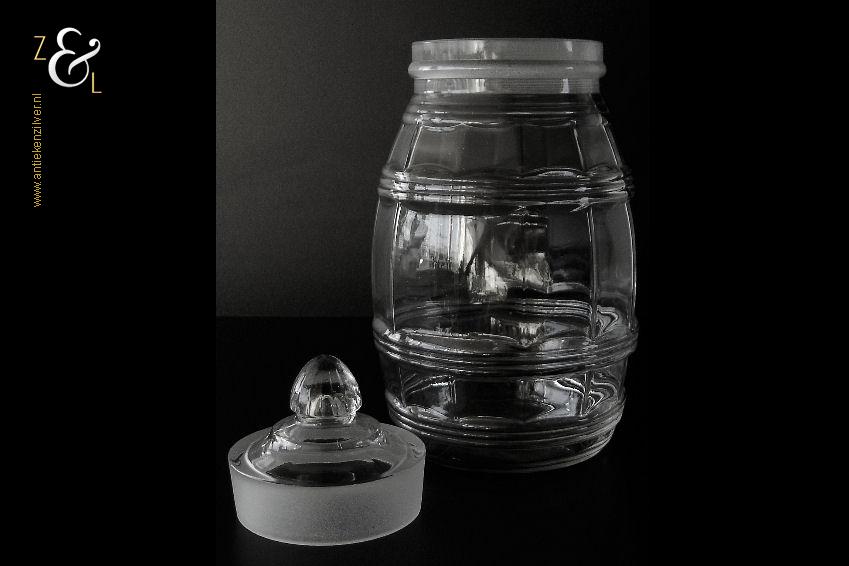 Deze snoep- voorraadpot is gemaakt in Nederland en stamt uit de vijftiger- zestiger jaren. De glazen snoep- voorraadpot in de vorm van een ton heeft twaalf duigen en de goed afsluitbare stop heeft een geribde knop. De pot en stop zijn geblazen in een mal, bij de stop heeft de mal een naad achtergelaten. De grote snoep- voorraadpot weegt 1249 gram heeft een diameter van 15.3 cm en is inclusief deksel gemeten 27.7 cm hoog. De snoep- voorraadpot heeft héél lichte gebruikssporen.