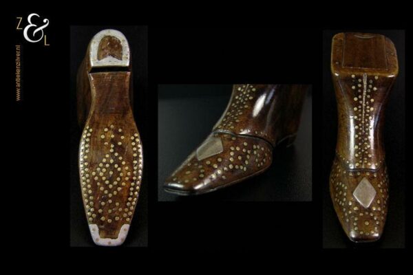 Deze houten snuifdoos in de vorm van een schoen is circa 1840 gemaakt in Engeland tijdens de vroeg Victoriaanse periode. De bijzonder mooi bewaard gebleven snuifdoos weegt 48 gram is 10.7 cm lang 3.5 cm breed en 5.4 cm hoog. De snuifdoos is gedecoreerd met koperen nageltjes van diverse maten en een zilveren pastille voor een monogram. Kleine houten voorwerpen worden in Engeland “treen” genoemd, deze snuifdoos valt ook hieronder.