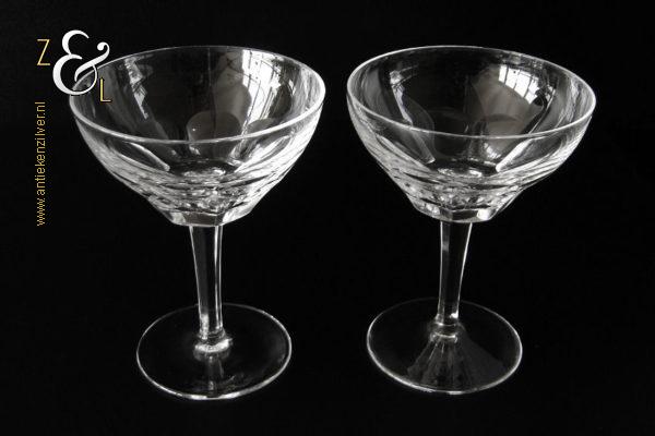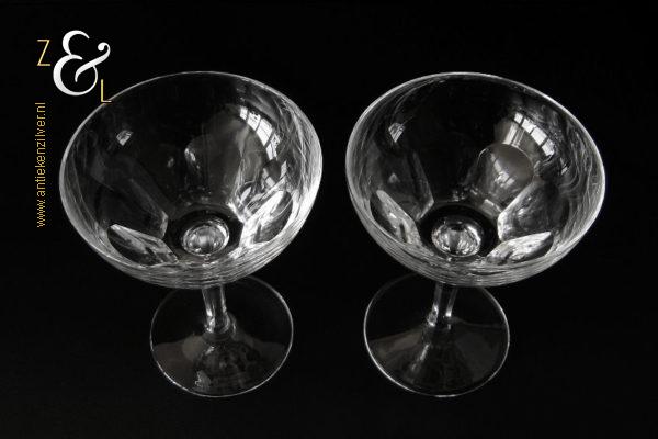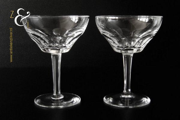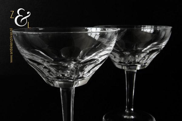 Dit stel champagneglazen / champagnecoupes / champagneschalen / likeurglazen model Julien is een ontwerp uit 1937 van de Nederlandse glasontwerper Willem Jacob Rozendaal en uitgevoerd bij de Kristal- en glasfabriek Kristalunie Maastricht. De zware in Art Deco stijl en in helder kristal vervaardigde glazen hebben een ronde voet met achtkantige steel en een kelk met acht ronde platribben. De champagneglazen / champagnecoupes / champagneschalen / likeurglazen wegen 503 gram en zijn 13.3 cm hoog. De bovenzijde van de glazen hebben een diameter van 10.2 cm en de voet heeft een diameter van 7.4 cm. Het glasservies Julien is op ambachtelijke wijze op de hand in een vorm mondgeblazen, hierdoor kunnen er kleine imperfecties optreden en hebben de glazen onderling een klein verschil in gewicht. Het glasservies Julien was zéér populair bij de afnemers van de Kristalunie en werd tot aan het begin van de jaren zestig geproduceerd.