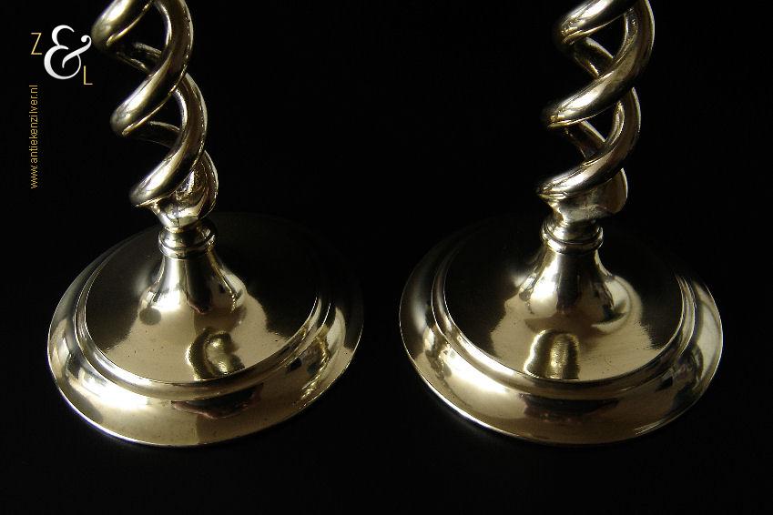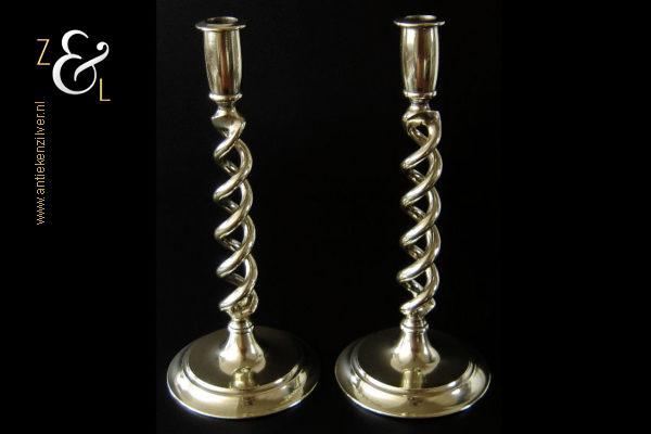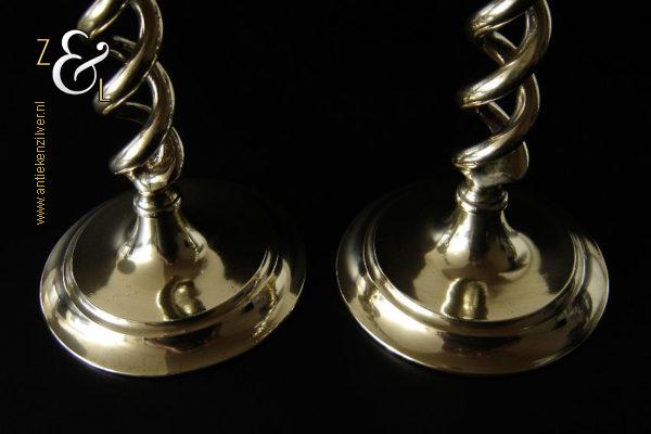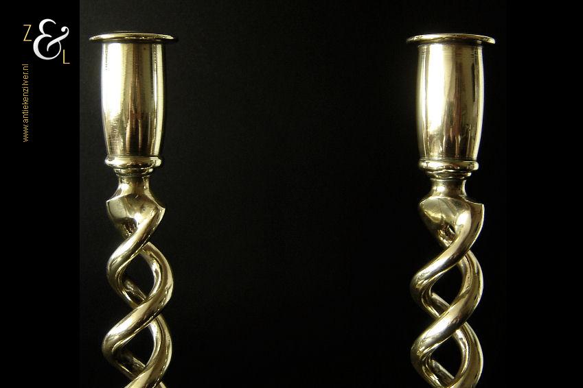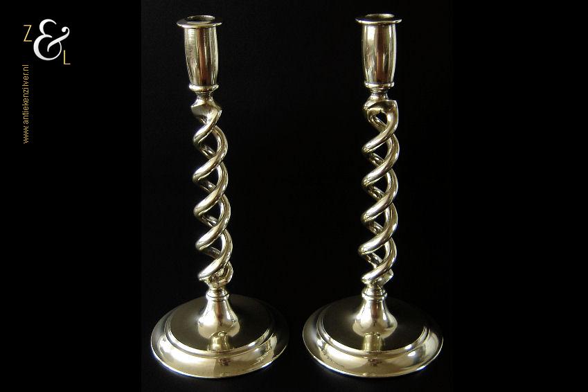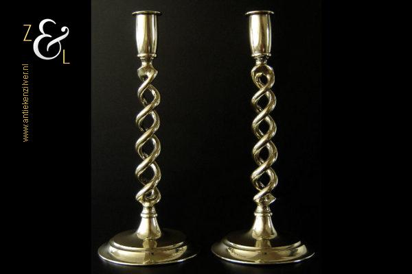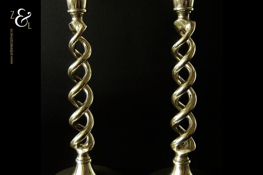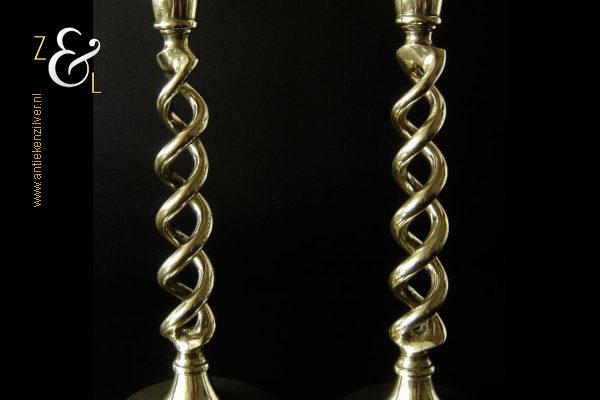 Dit stel messing open dubbel gedraaide kandelaars is gemaakt in Engeland aan het einde van de 19e eeuw / begin 20e eeuw. De kandelaars die in Nederland bekend staan onder de naam: open dubbel gedraaide of open twist kandelaars of in het Engels: open twist, double twisted of open Barley twist candlesticks zijn 30.2 cm hoog hebben een ronde voet met een diameter van 13.4 cm en wegen samen 1761 gram. De kandelaars zijn geschikt voor kaarsen met een diameter van 2.2 cm. De kandelaars hebben licht verbogen voeten.