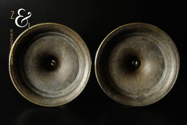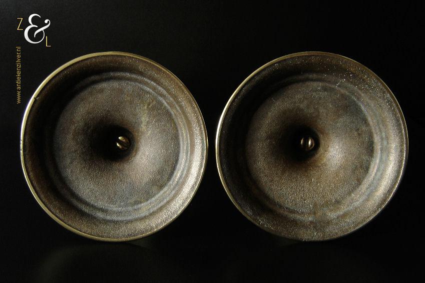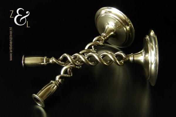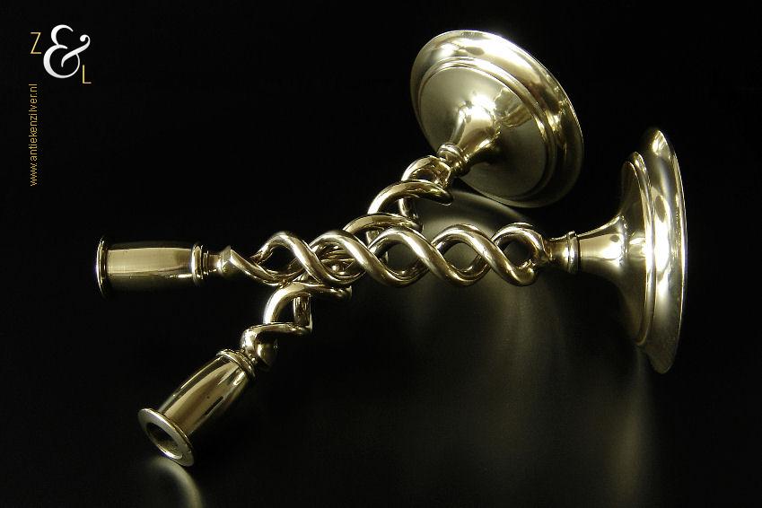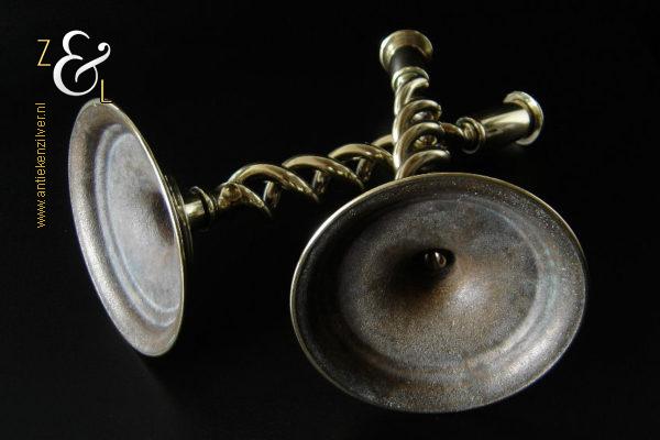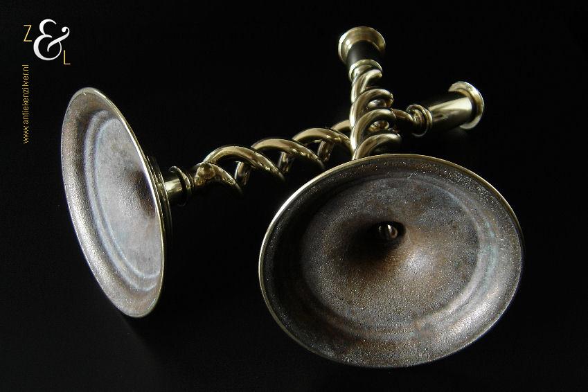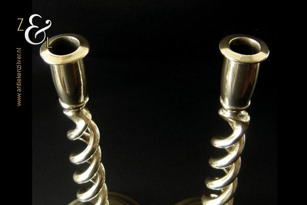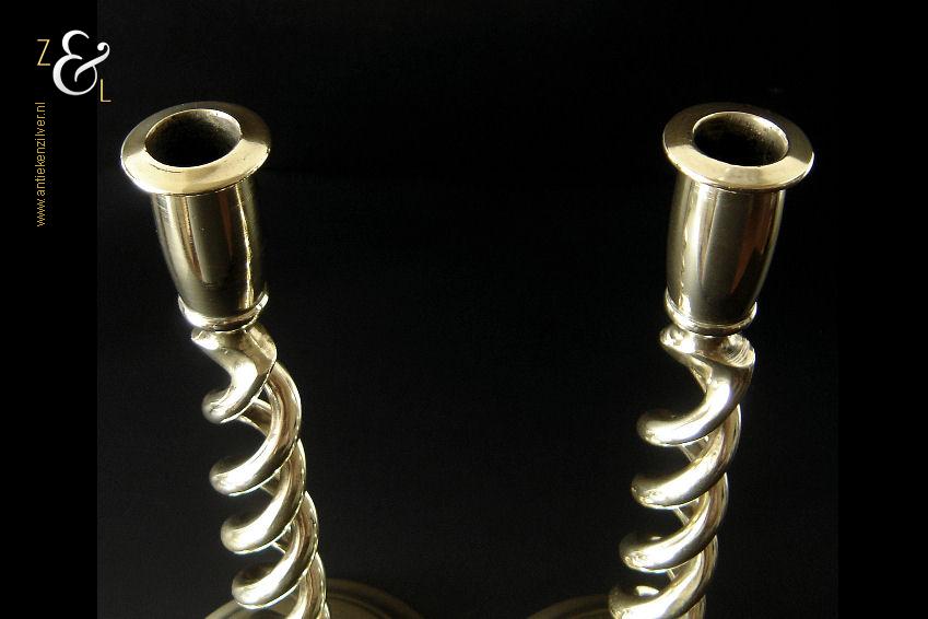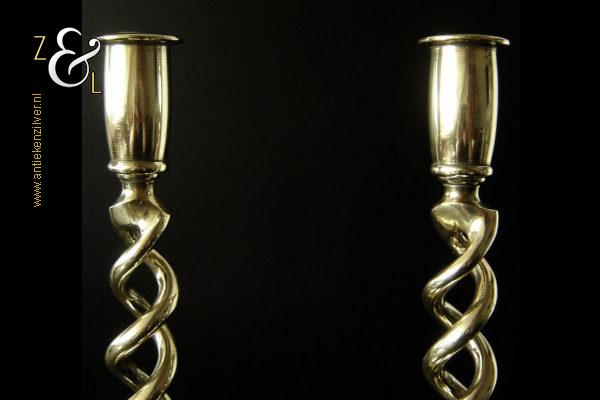Dit stel messing open dubbel gedraaide kandelaars is gemaakt in Engeland aan het einde van de 19e eeuw / begin 20e eeuw. De kandelaars die in Nederland bekend staan onder de naam: open dubbel gedraaide of open twist kandelaars of in het Engels: open twist, double twisted of open Barley twist candlesticks zijn 30.2 cm hoog hebben een ronde voet met een diameter van 13.4 cm en wegen samen 1761 gram. De kandelaars zijn geschikt voor kaarsen met een diameter van 2.2 cm. De kandelaars hebben licht verbogen voeten.