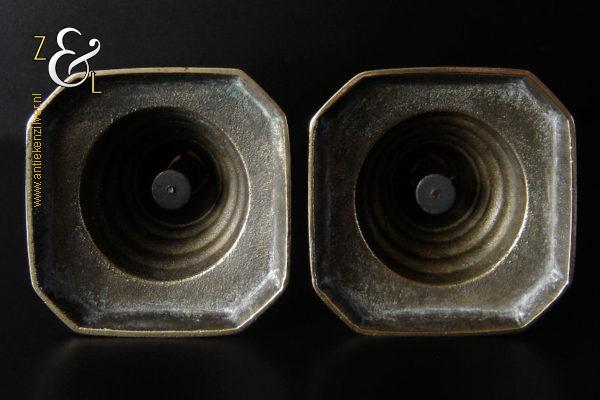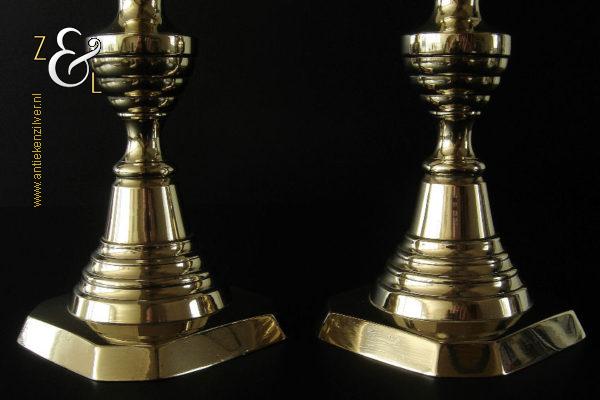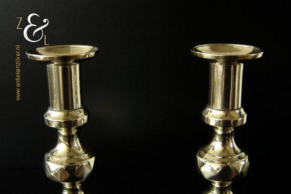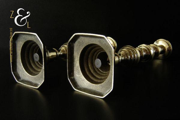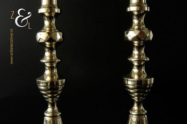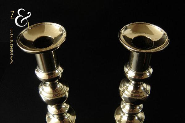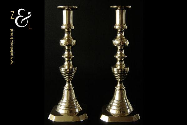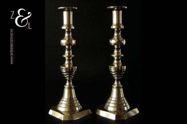 Dit stel messing kandelaars is gemaakt in Engeland tijdens de tweede helft van de 19e eeuw de Victoriaanse periode die liep van 1837 tot 1901. De kandelaars waarvan de balustervormige stelen zijn uitgevoerd met een omgekeerde Bijenkorf en gefacetteerde knop “Diamant” zijn 27.5 cm hoog, hebben een vierkante voet met afgeschuinde hoeken van 10.2 cm bij 10.2 cm en wegen samen 979 gram. De kandelaars zijn geschikt voor kaarsen met een diameter van 2.1 cm en hebben een bobèche (kaarsvetopvanger) met een diameter van 5.1 cm. De kandelaars zijn voorzien van een zogenaamd “Push up ejection mechanism” (duwuitwerp-mechanisme) een patent van James Barlow sinds 1839, hiermee kan men na het branden van een kaars op een gemakkelijke wijze het overgebleven kaarsvet of de kaarsstomp verwijderen. James Barlow Brass Candlestick Maker te Birmingham was een fabrikant van diverse messing en koperen gebruiksartikelen.