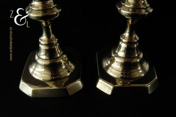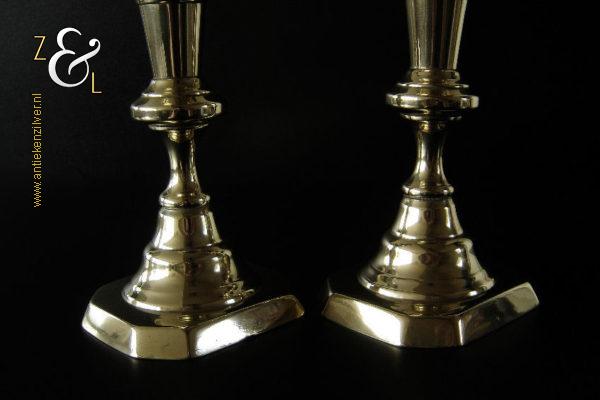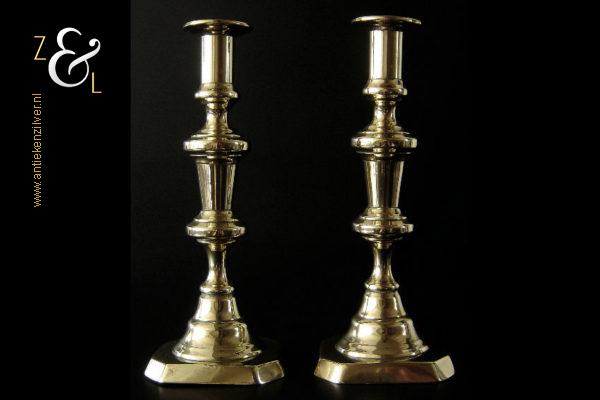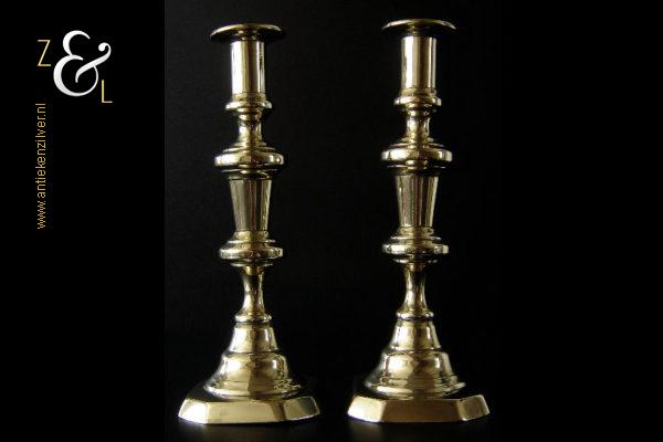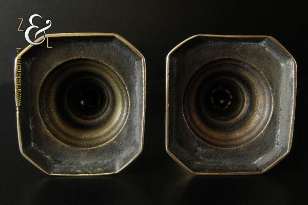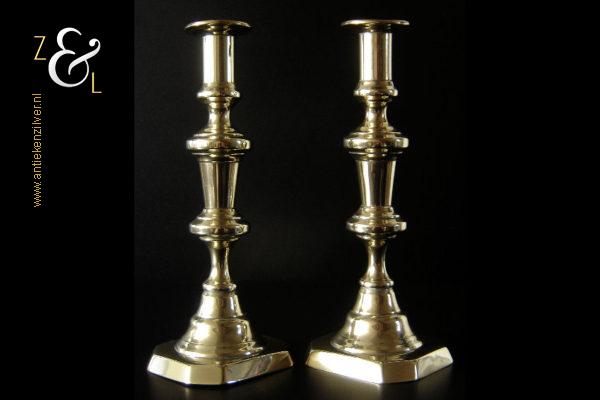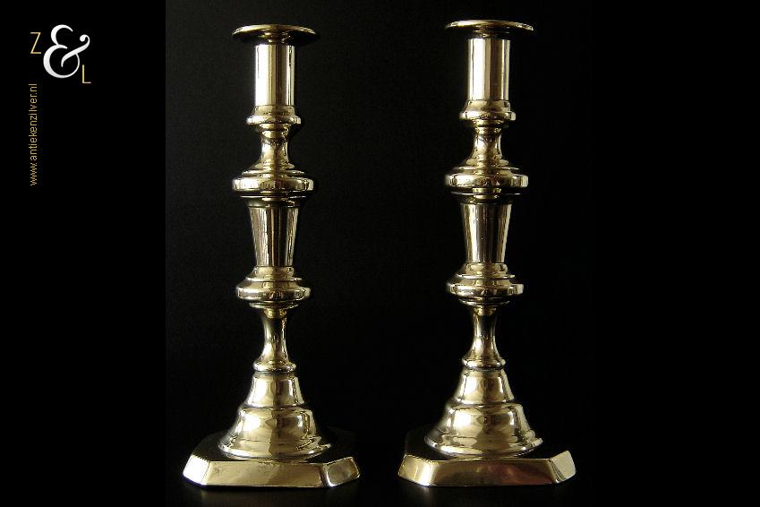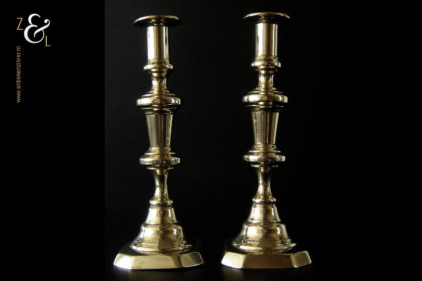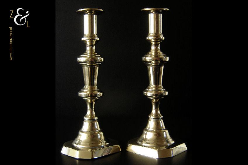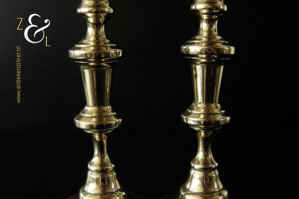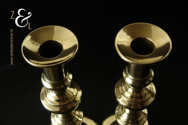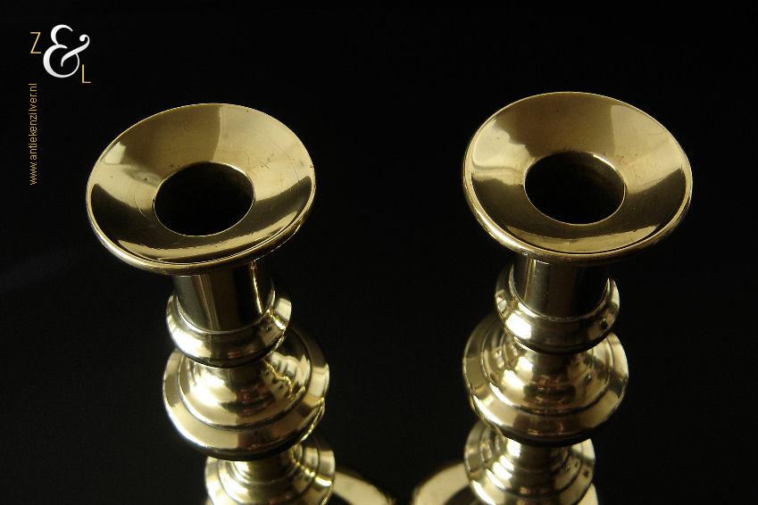 Dit stel messing kandelaars is gemaakt in Engeland tijdens de tweede helft van de 19e eeuw de Victoriaanse periode die liep van 1837 tot 1901. De kandelaars waarvan de balustervormige stelen zijn uitgevoerd in Art Deco stijl zijn 26.5 cm hoog hebben een rechthoekige voet met afgeschuinde hoeken van 9.6 cm bij 10.8 cm en wegen samen 1036 gram. De kandelaars zijn geschikt voor kaarsen met een diameter van 2.2 cm en hebben een bobèche (kaarsvetopvanger) met een diameter van 5.2 cm. Tevens zijn de kandelaars voorzien van een zogenaamd “Push up ejection mechanism” (duwuitwerp-mechanisme) een patent van James Barlow sinds 1839, hiermee kan men na het branden van een kaars op een gemakkelijke wijze het overgebleven kaarsvet of de kaarsstomp verwijderen. James Barlow Brass Candlestick Maker te Birmingham was een fabrikant van diverse messing en koperen gebruiksartikelen. Bij de kandelaars zijn de voeten enigszins verbogen en zijn de ronde duwschijfjes van het “Push up ejection mechanism” (duwuitwerp-mechanisme) kwijtgeraakt zie geel omkaderde gedeeltes op afbeeldingen.