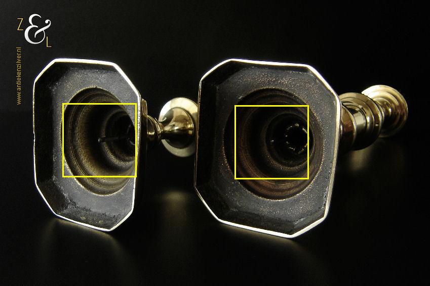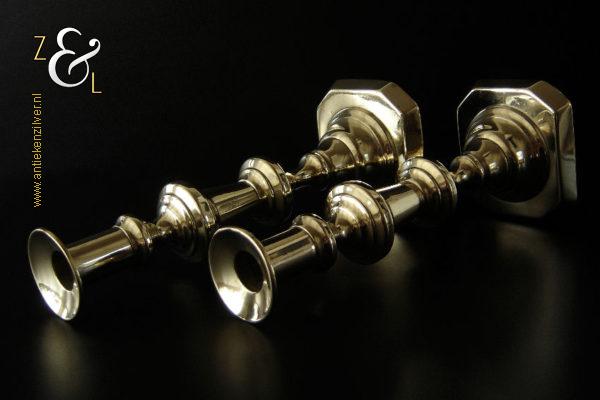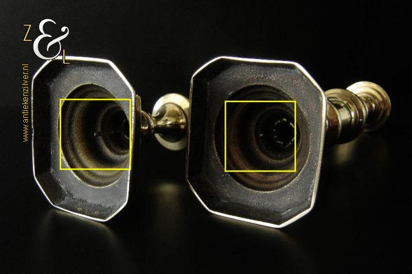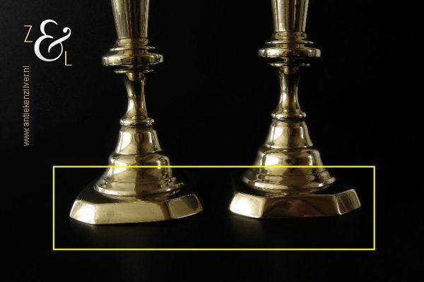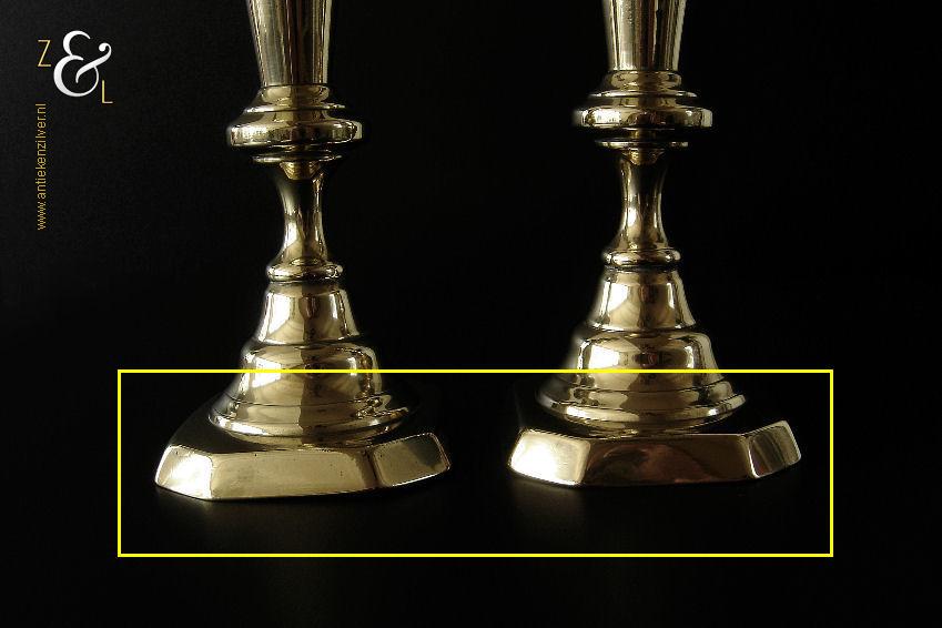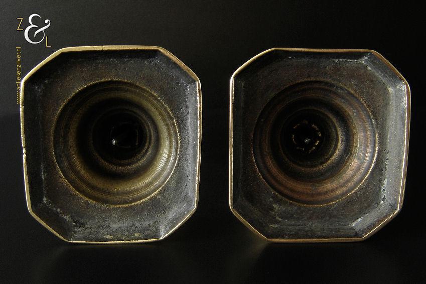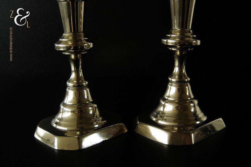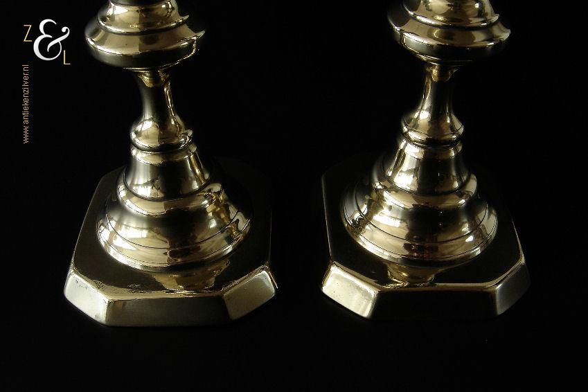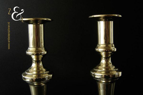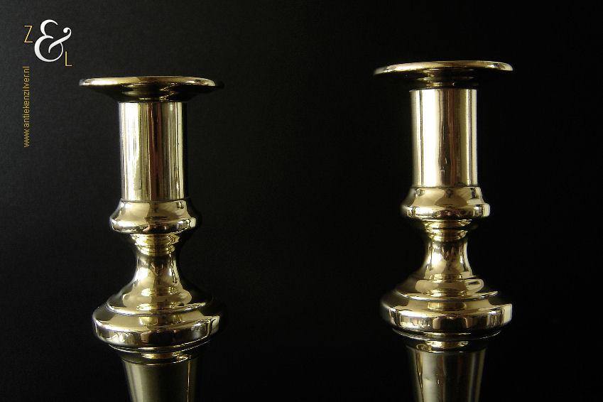 Dit stel messing kandelaars is gemaakt in Engeland tijdens de tweede helft van de 19e eeuw de Victoriaanse periode die liep van 1837 tot 1901. De kandelaars waarvan de balustervormige stelen zijn uitgevoerd in Art Deco stijl zijn 26.5 cm hoog hebben een rechthoekige voet met afgeschuinde hoeken van 9.6 cm bij 10.8 cm en wegen samen 1036 gram. De kandelaars zijn geschikt voor kaarsen met een diameter van 2.2 cm en hebben een bobèche (kaarsvetopvanger) met een diameter van 5.2 cm. Tevens zijn de kandelaars voorzien van een zogenaamd “Push up ejection mechanism” (duwuitwerp-mechanisme) een patent van James Barlow sinds 1839, hiermee kan men na het branden van een kaars op een gemakkelijke wijze het overgebleven kaarsvet of de kaarsstomp verwijderen. James Barlow Brass Candlestick Maker te Birmingham was een fabrikant van diverse messing en koperen gebruiksartikelen. Bij de kandelaars zijn de voeten enigszins verbogen en zijn de ronde duwschijfjes van het “Push up ejection mechanism” (duwuitwerp-mechanisme) kwijtgeraakt zie geel omkaderde gedeeltes op afbeeldingen.