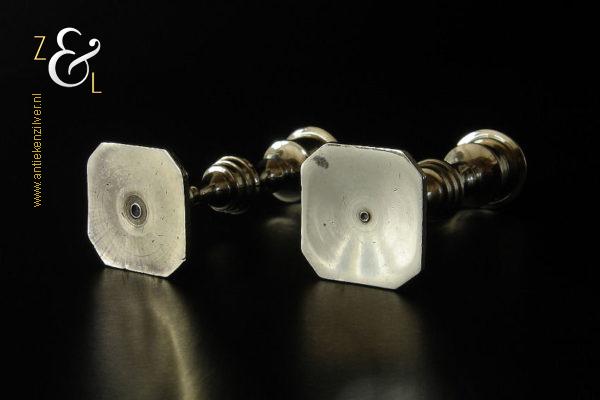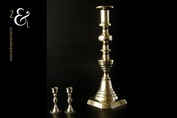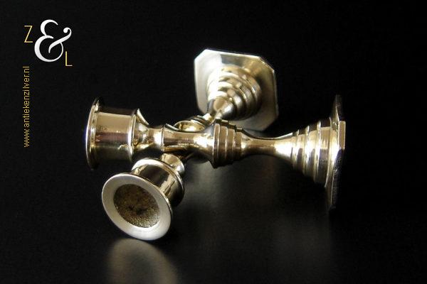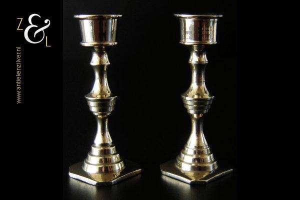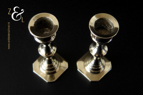 Dit stel messing miniatuur kandelaars is gemaakt in Engeland omstreeks de eerste helft van de 20e eeuw. De miniatuur kandelaars waarvan de balustervormige stelen zijn uitgevoerd met een omgekeerde bijenkorf zijn 6.4 cm hoog, hebben een vierkante voet met van 2.5 cm bij 2.5 cm en wegen samen 90 gram.