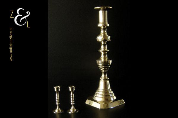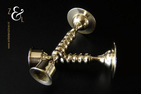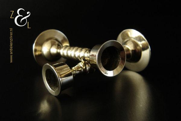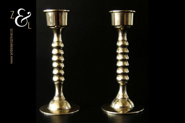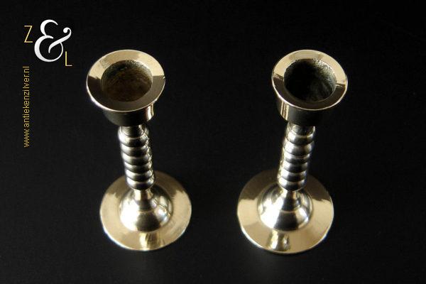 Dit stel messing miniatuur kandelaars is gemaakt in Engeland omstreeks de eerste helft van de 20e eeuw. De miniatuur kandelaars waarvan de stelen in model bobbin zijn uitgevoerd zijn 6.8 cm hoog, hebben een ronde voet met een diameter van 3 cm en wegen samen 82 gram.