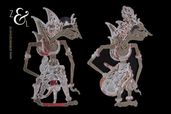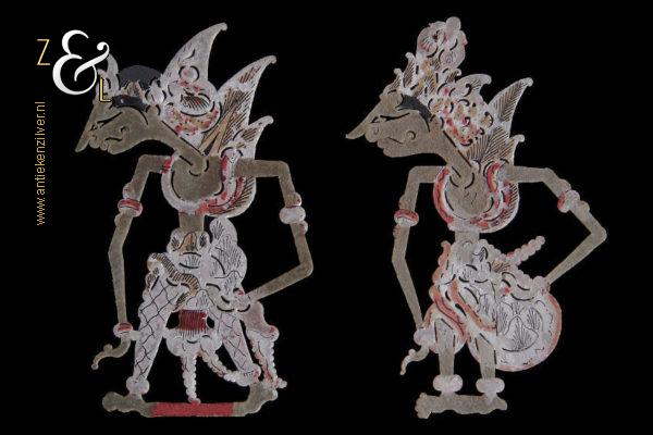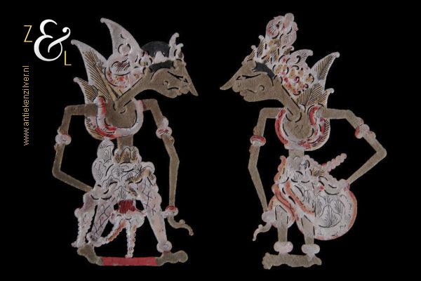 Dit stel kleine Wajangpoppen is gemaakt in Indonesië en stamt uit de 20e eeuw. De rood, wit goud beschilderde Wajangpoppen die vermoedelijk omstreeks de jaren vijftig verkocht zijn als souvenir (kinderspeelgoed), zijn 13 cm lang bij 7.5 cm breed. Het stel wajangpoppen heeft slijtagesporen.
