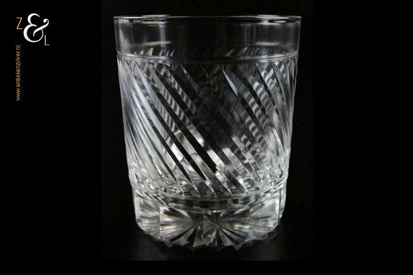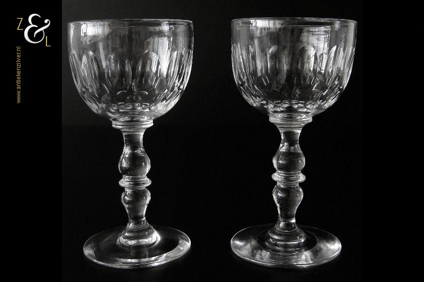 Dit stel mondgeblazen en geheel op de hand vervaardigde kristallen wijnglazen / portglazen is gemaakt in Nederland of Engeland en stamt uit het eind van de 19e eeuw en het begin van de 20e eeuw. De handgeslepen en gepolijste glazen hebben een ronde kelk met een dubbele rij van dertien geslepen olijven en een balustervormige steel met in het midden een scherp gehoekte knoop. Aan de onderzijde van de voeten zit een gedeeltelijk in de vorm van een lens weggeslepen pontilmerk. Het stel wijnglazen / portglazen weegt samen 220 gram en is 11.2 cm hoog. De kelken hebben een diameter van 5.8 cm en de voeten hebben een diameter van 5.5 cm. Het stel antieke wijnglazen / portglazen is op ambachtelijke wijze mondgeblazen en op de hand vervaardigd, hierdoor kunnen er kleine imperfecties optreden en hebben de glazen onderling een klein verschil in maat en gewicht.