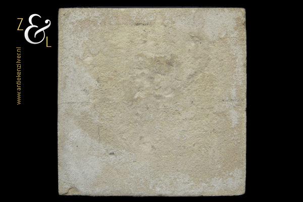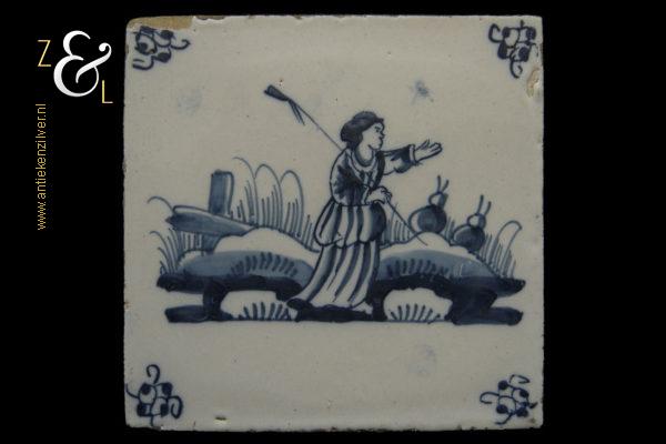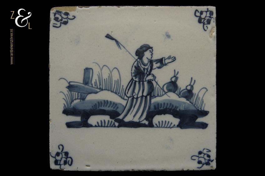 Deze tegel is aan het einde van de 17e eeuw begin 18e eeuw gemaakt in Nederland. De op de hand beschilderde blauw witte tegel heeft de afbeelding van een herderin in een landschap met in haar rechterhand een staf, op de achtergrond staat een hek met twee schapen of koeien, de hoeken zijn gedecoreerd met het hoekmotief spin. De tegel weegt 237 gram meet 13.1 cm bij 13 cm en is 0.8 cm dik.