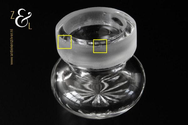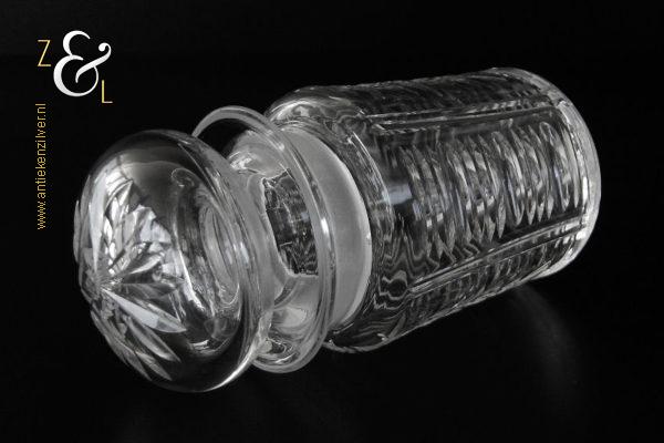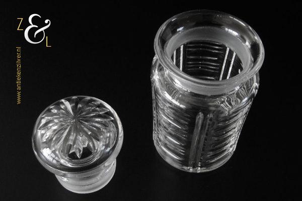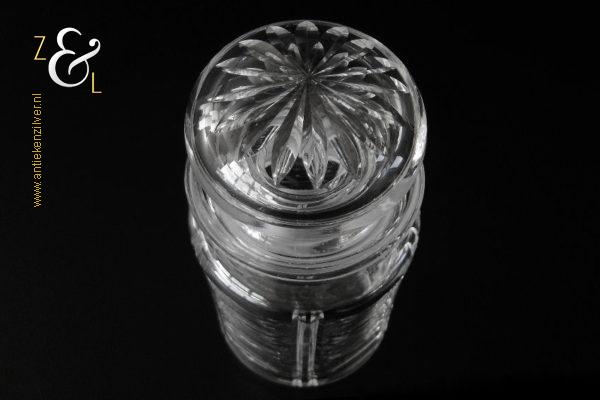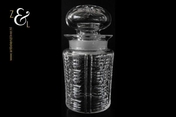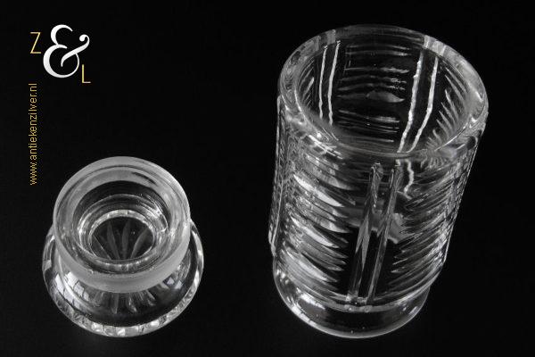 Deze theebus in de vorm van een cilinder is gemaakt in Nederland en stamt uit de eerste helft van de 20e eeuw. De in Art Deco stijl en in helder kristal vervaardigde theebus is mondgeblazen, handgeslepen en gepolijst met op de stop een stermotief en op de bus lange verticale lijnen met daartussen horizontale lijnen en olijven. De theebus weegt 336 gram heeft een diameter van 7 cm en is 13.8 cm hoog. De theebus heeft gebruikssporen (lichte krasjes aan de onderzijde) en de stop heeft twee héél kleine schilfertjes aan de stop zie geel omkaderd gedeelte op afbeelding.