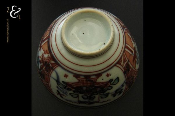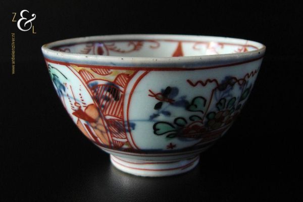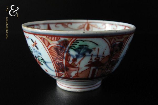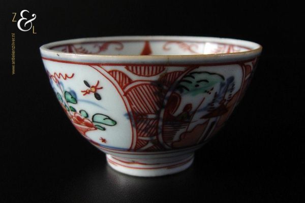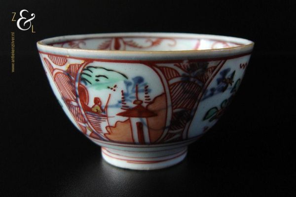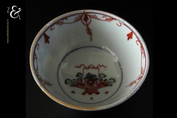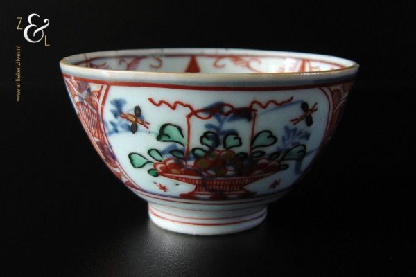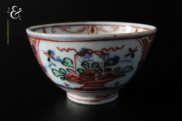 Dit porseleinen theekopje stamt uit de 18e eeuw en is gemaakt in China. Het met bloemenmanden en een hengelend mannetje naast een huisje gedecoreerde theekopje is op de hand beschilderd en heeft de typische kleuren van Amsterdams Bont: ijzerrood, groen en goud. Het theekopje heeft een diameter van 8.1 cm is 4.5 cm hoog en weegt 79 gram.