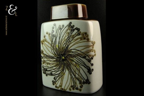 Deze zogenaamde kussenvaas met daarop de afbeelding van een gestileerde bloem en met een koffiebruine hals is gemaakt bij Royal Copenhagen te Denemarken, de fajance vaas die behoort tot de zogenaamde BACA serie is een klassieker die stamt uit de late zestiger jaren begin zeventiger jaren en is ontworpen door de beroemde Deense aardewerk en porselein ontwerper Ellen Malmer. Aan de onderzijde is de vaas gemerkt met Royal Copenhagen Denmark, Fajance, het decoratienummer 635/3121 en in de BACA cirkel de initialen van Ellen Malmer. De vaas weegt 721 gram en is cm 19 cm hoog 8.8 cm breed en 14.6 cm diep.