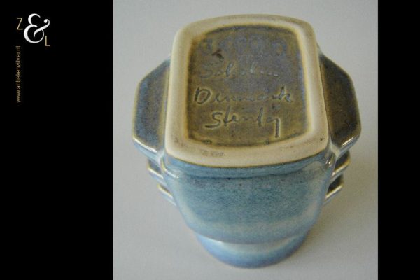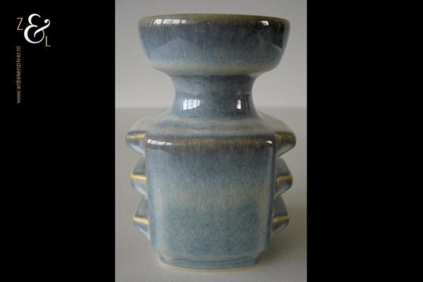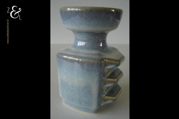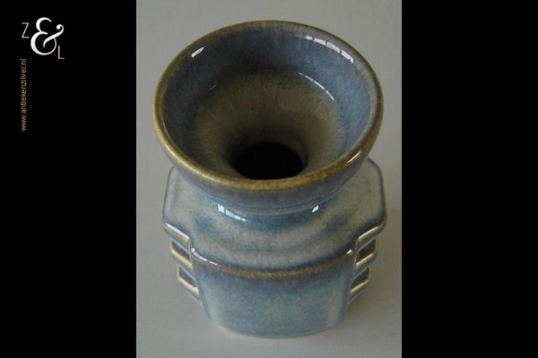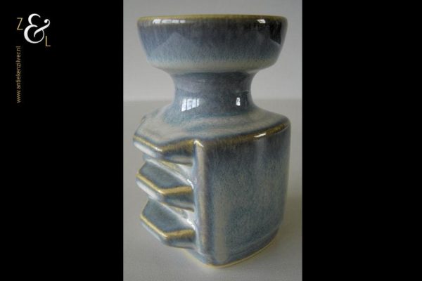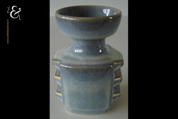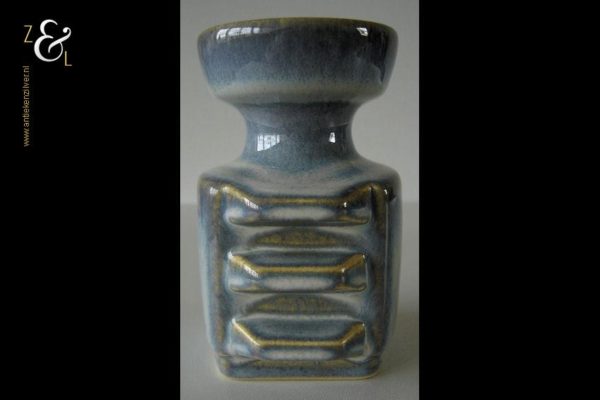 Deze keramische vaas met een glanzende pastelblauwe en zandkleurige glazuur is geproduceerd bij de Søholm Stentøj fabriek te Bornholm Denemarken. De vaas is een ontwerp van Einar Johansen en aan de onderzijde gemerkt met Søholm Stentøj Denemarken en het modelnummer 3400. De vaas is 8 cm lang 7 cm breed 11 cm hoog en weegt 439 gram.