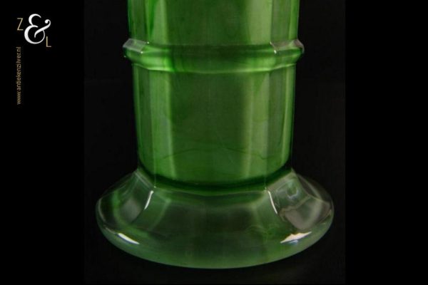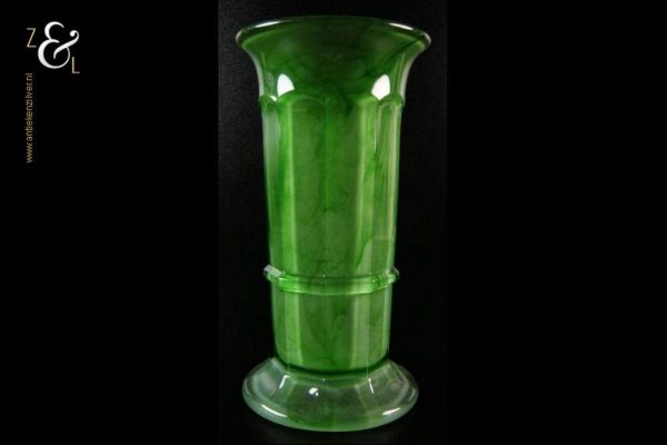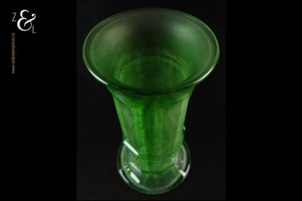 Deze groen gemarmerde Art Deco persglazen vaas is tussen 1928 en 1942 gemaakt bij de George Davidson & Co. Teams glasfabrieken. De Davidson model 279 vaas (in Engeland: green cloud glass vase) werd in drie maten gemaakt waarvan deze de middelste is. De vaas die voorzien is van negen vlakken heeft aan de buitenzijde een glanzend oppervlak en is aan de binnenkant mat wat een heel apart effect geeft hij weegt 766 gram is 20.7 cm hoog en heeft aan de bovenkant een diameter van 10.5 cm de voet heeft een diameter van 10.2 cm.