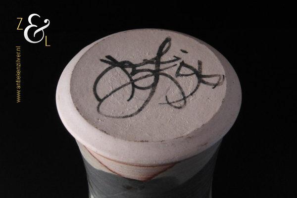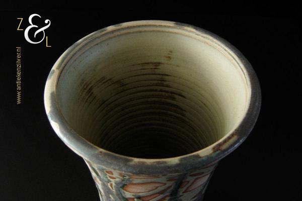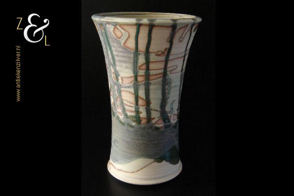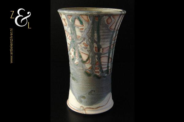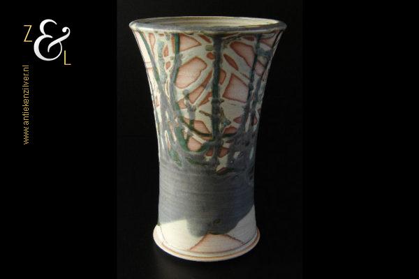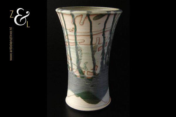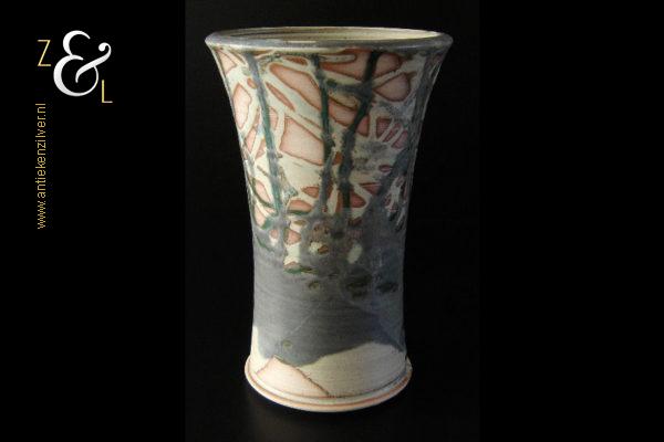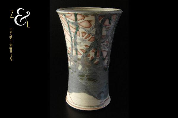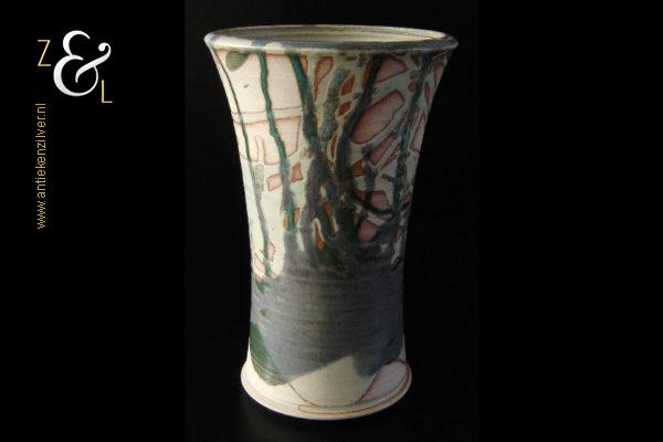 Deze aardewerk vaas die rondom gedecoreerd is met een gestileerd landschap is gemaakt door Bob Ernsting bij het Atelier van Ernsting Keramiek dat sinds 1979 in de Zuidoostbeemster is gevestigd. De vaas die beschilderd is met meervoudig in elkaar vloeiende glazuren is aan de onderzijde gedateerd ’96 en draagt de signatuur van Bob Ernsting. De vaas weegt 1433 gram is 24 cm hoog en heeft een diameter aan de bovenkant van 15.5 cm en een diameter van 12 cm aan de onderkant.