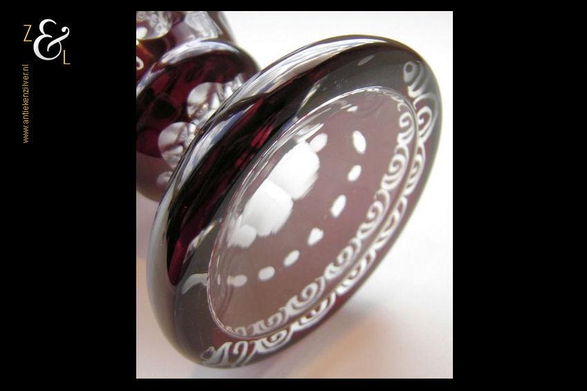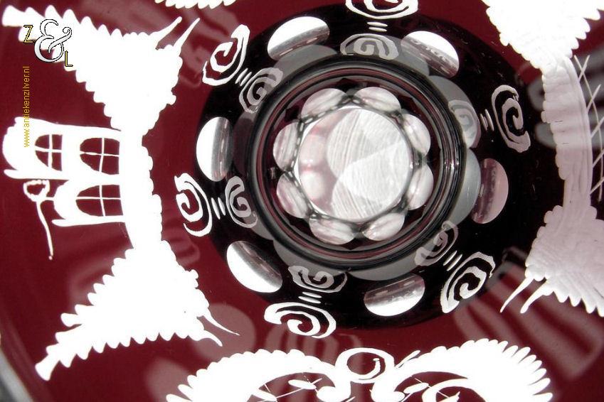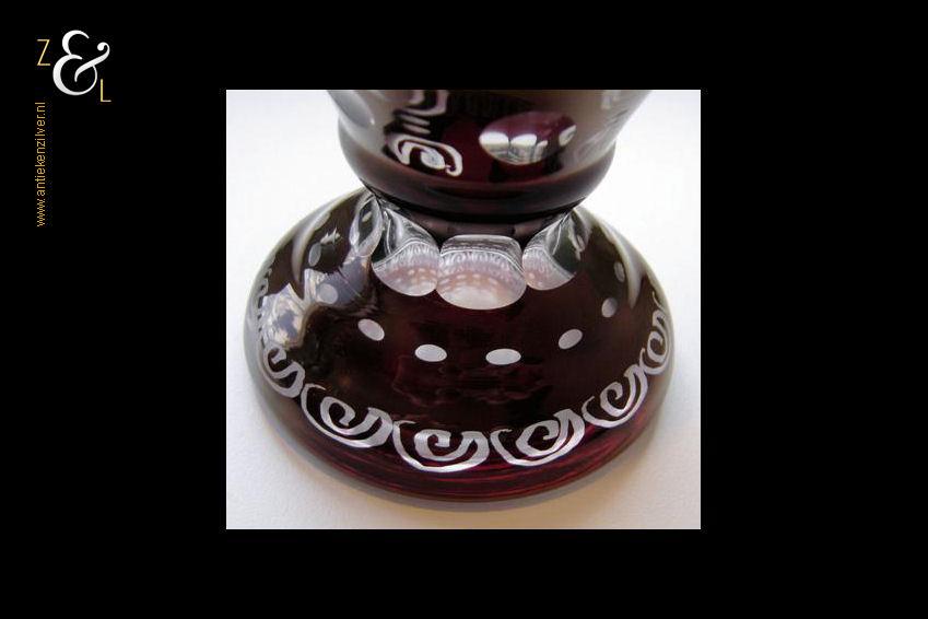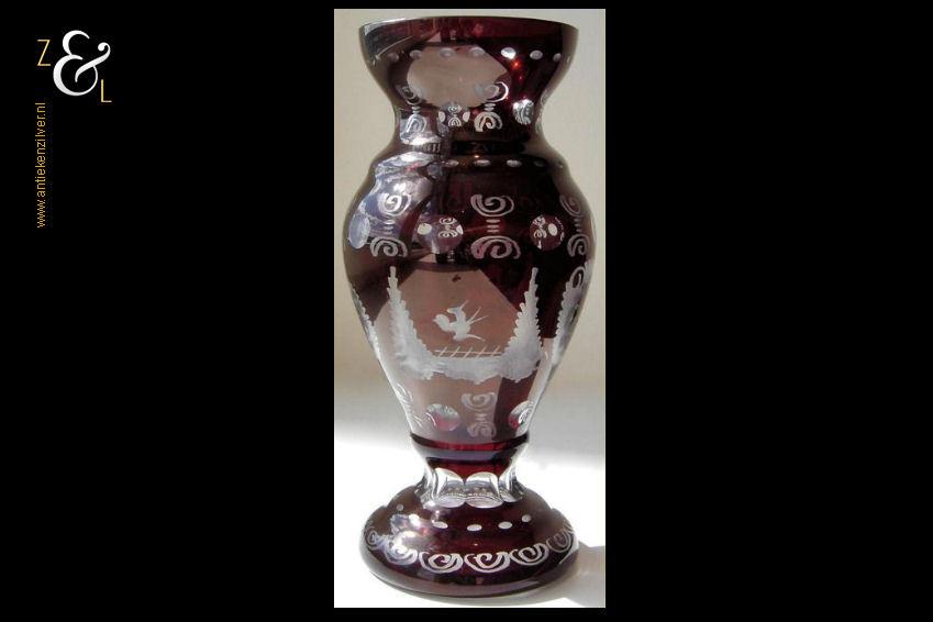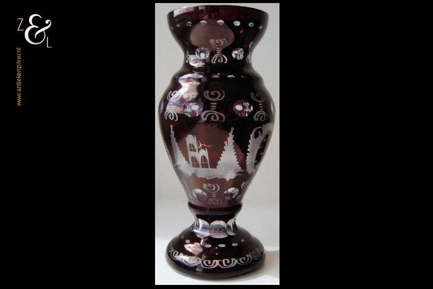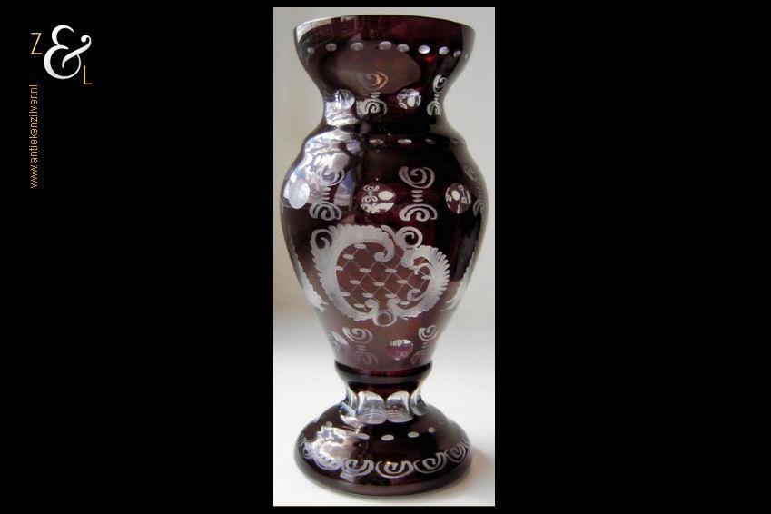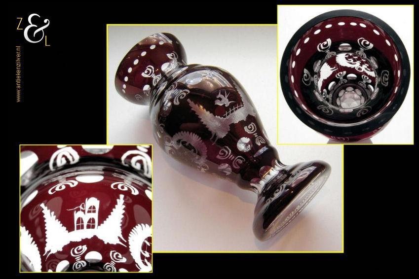 Deze robijnrode vaas is in de 20e eeuw gemaakt bij de glasfabriek Egermann gelegen in de stad Novy Bor in de omgeving van Noord-Bohemen, Tsjechië. De mondgeblazen en op de hand geslepen, geëtste en gegraveerde vaas weegt 680 gram is 21 cm hoog en heeft een diameter van 9 cm.