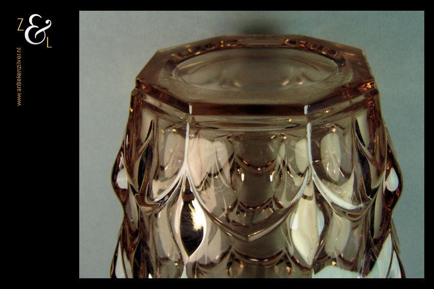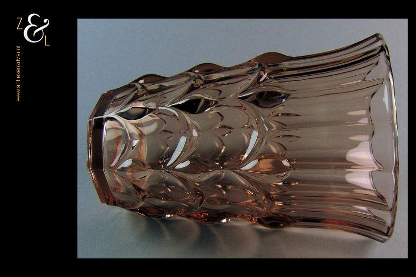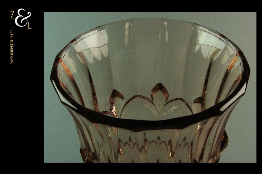 Deze originele roze Art Deco vaas model “Ronald” is in 1935 gemaakt bij de glasfabriek van Luxval te België. De persglazen vaas weegt 1700 gram is 21,5 cm hoog en heeft aan de bovenzijde een diameter van 15 cm en aan de onderzijde een diameter van 9 cm.