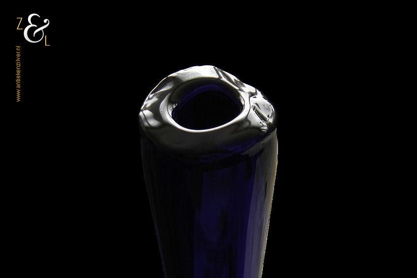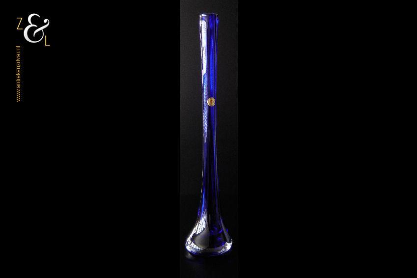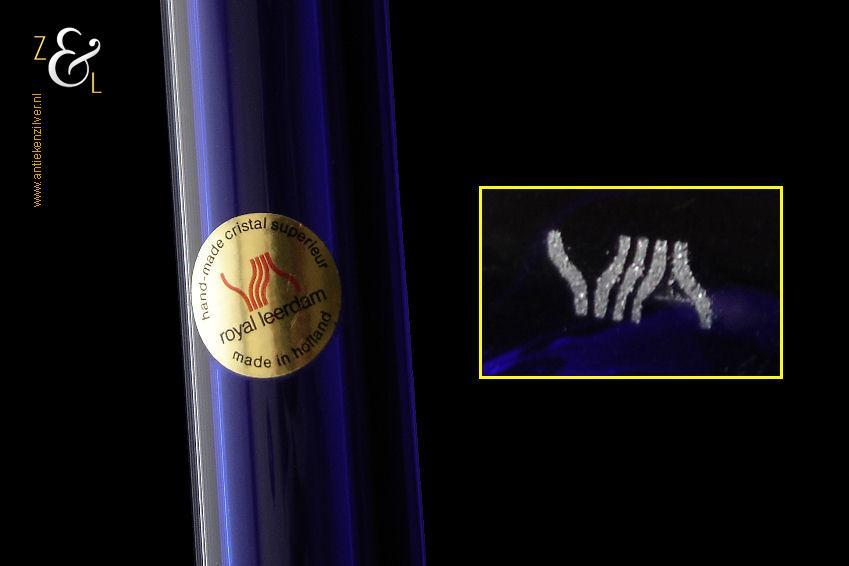 Deze kristallen Vaas / Fles / Flesvaas naar het ontwerp van Siem van der Marel is gemaakt in Leerdam bij de beroemde glasfabriek Royal Leerdam. De Vaas / Fles / Flesvaas die de voorloper van de huidige “Iris” serie is en die in een prachtige blauwe kleur is uitgevoerd heeft de originele sticker met de tekst: Hand- made Crystal superieure / Royal Leerdam / Made in Holland. Aan de onderzijde van de Vaas / Fles / Flesvaas zit het etsmerk van de glasfabriek Royal Leerdam. De Vaas / Fles / Flesvaas weegt 1435 gram is 44.5 cm hoog en heeft een diameter van 9.2 cm.