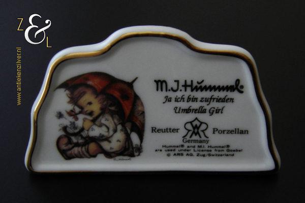 Dit verkoopdisplay is gemaakt door de Reutter Porseleinfabriek in West-Duitsland, voor het servies met het decor van “Ja ich bin zufrieden Umbrella girl” waarvoor licentie was verkregen van Goebel. Op het porseleinen verkoopdisplay staat de afbeelding van “Ja ich bin zufrieden Umbrella girl” naar het ontwerp van M.I. Hummel en de tekst Reutter Porzellan Germany Hummel and M.I. Hummel are used under licence from Goebel ARS AG. Zug / Switserland. Het verkoopdisplay dat met een gouden rand is afgezet weegt 46 gram en is 5 cm hoog bij 8.7 cm breed.