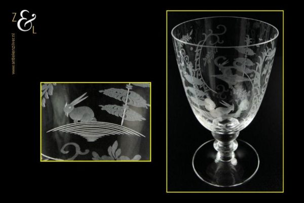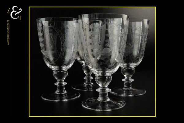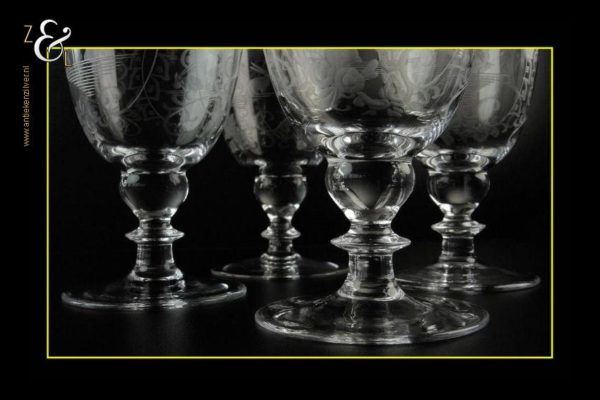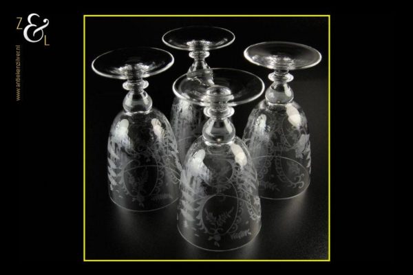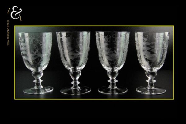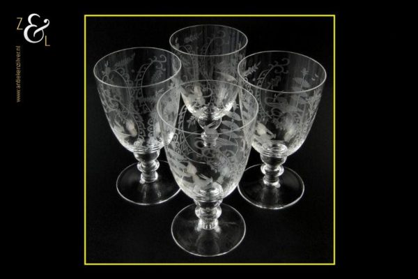 Deze vier kristallen wijnglazen / waterglazen zijn gemaakt in het plaatsje Baccarat in de regio Lotharingen te Frankrijk bij de gelijknamige kristalfabriek Baccarat. De mondgeblazen handgeslepen en gepolijste glazen die uit de 20e eeuw stammen hebben balustervormige stelen en zijn geëtst met de voorstelling van een haas, gestileerde boompjes enzovoorts. De vier wijnglazen / waterglazen wegen 762 gram en zijn 16.2 cm hoog. De kelken hebben een diameter van 9.2 cm en de voeten hebben een diameter van 8.2 cm.