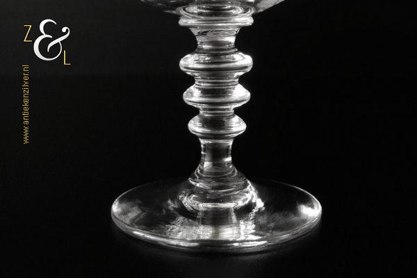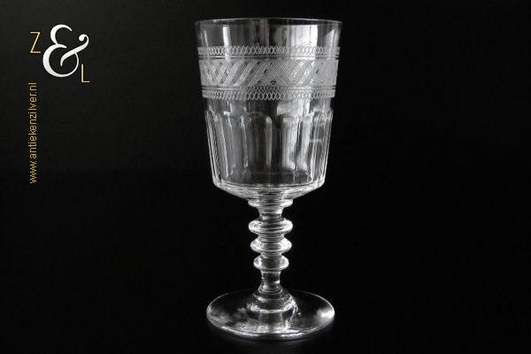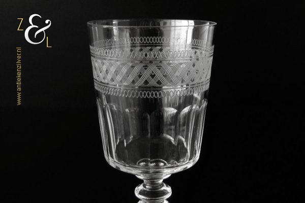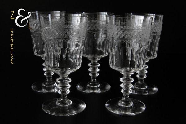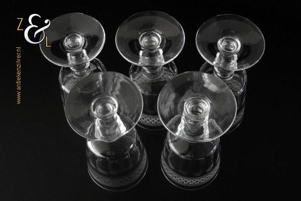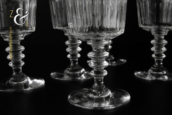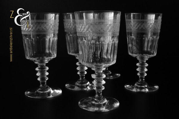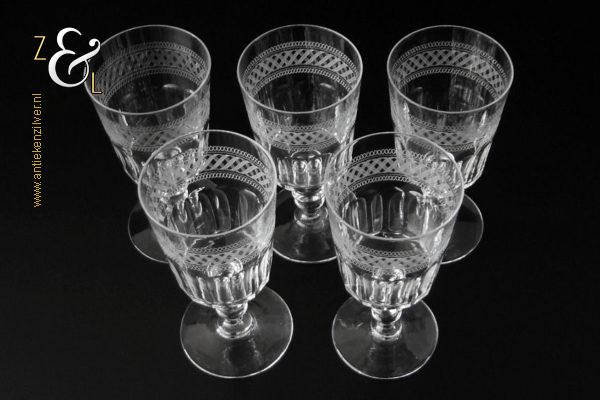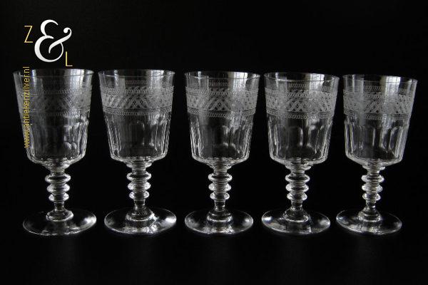 Deze vijf kristallen wijnglazen in Art Deco stijl waarvan wij de herkomst nog niet vastgesteld hebben (vermoedelijk Glas- Kristalfabriek Baccarat Frankrijk) stammen uit de vorige eeuw en zijn op de hand gemaakt, mondgeblazen, geëtst, geslepen en gepolijst. De wijnglazen hebben bijzonder gevormde stelen met drie knopen, emmervormige kelken met ieder dertien geslepen ribben en aan de bovenzijde een geëtste rand met slingermotief. De vijf kristallen wijnglazen wegen samen 1072 gram zijn 15.4 cm hoog en hebben een diameter van 7.3 cm (de glazen die op de hand gemaakt en gevormd zijn hebben licht afwijkende gewichten en maten wat bij handwerk gebruikelijk is).